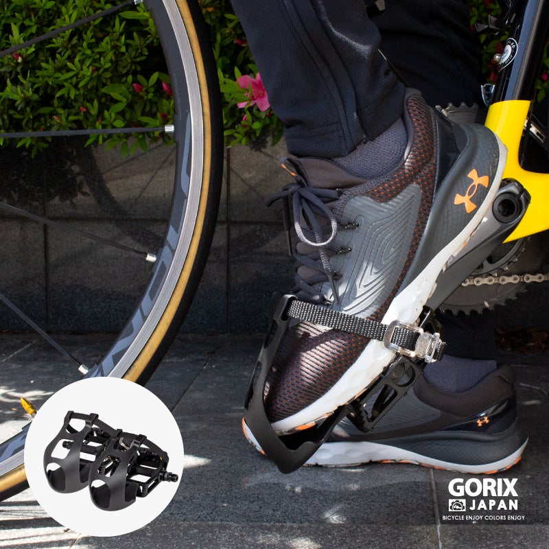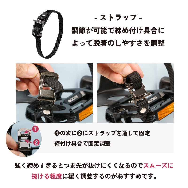 (ペダル)アルミ合金本体、クロモリ鋼軸(ストラップ)ナイロン(クリップ)樹脂素材 |