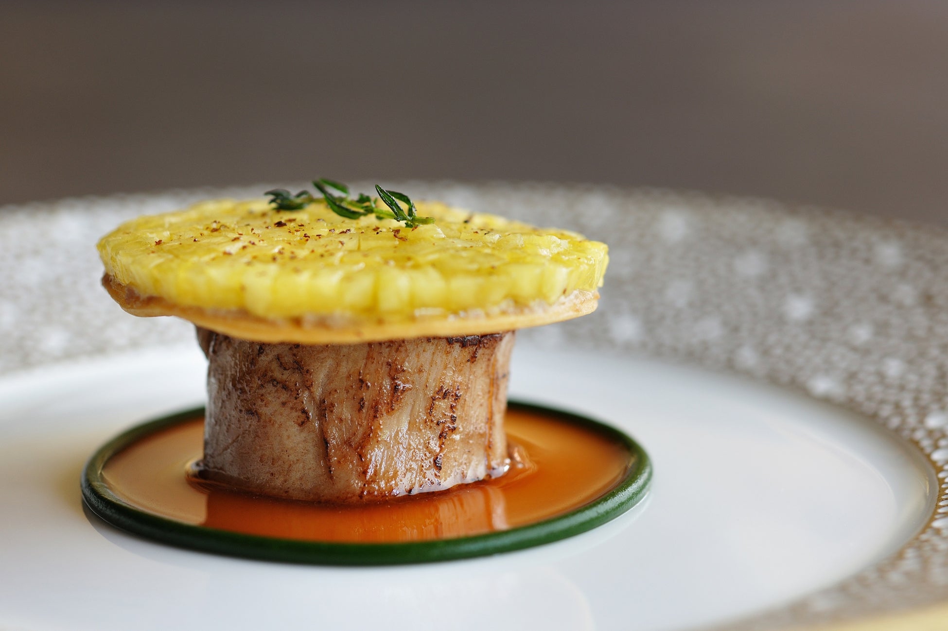 低温で時間をかけてローストした豚フィレ肉には、パイナップルを食べて育った豚を使用しています。このため、肉の上に乗せたパイナップルのタルトとの相性が抜群です。豚は、本州とは異なる沖縄の食文化の1つとして「鳴き声以外はすべて食べる」と言われ、余すところなく食されてきました。この文化から着想を得て、豚骨やレバーやも取り入れた、豚の旨味を存分に堪能できる料理です。