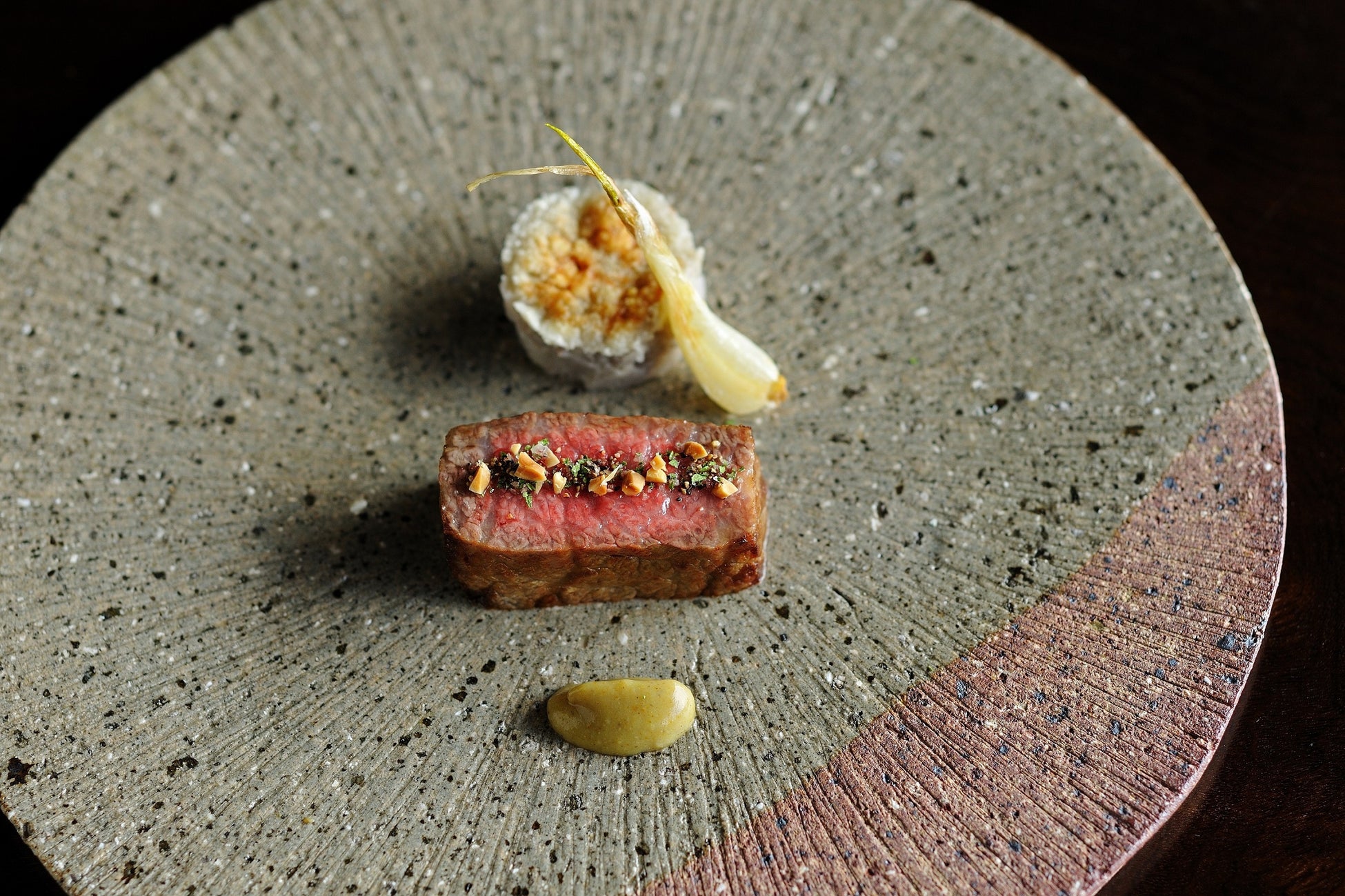 「ドライエイジング」*3で旨味を凝縮した黒毛和牛を、炭火で香ばしく焼き上げました。熟成香に合わせたローストナッツや、爽やかな風味の長命草(ちょうめいそう)が肉の旨味と甘みを引き立てます。さらに、スパイスを効かせたバナナのソースが味わいの変化を生み、飽きの来ない一皿になっています。
