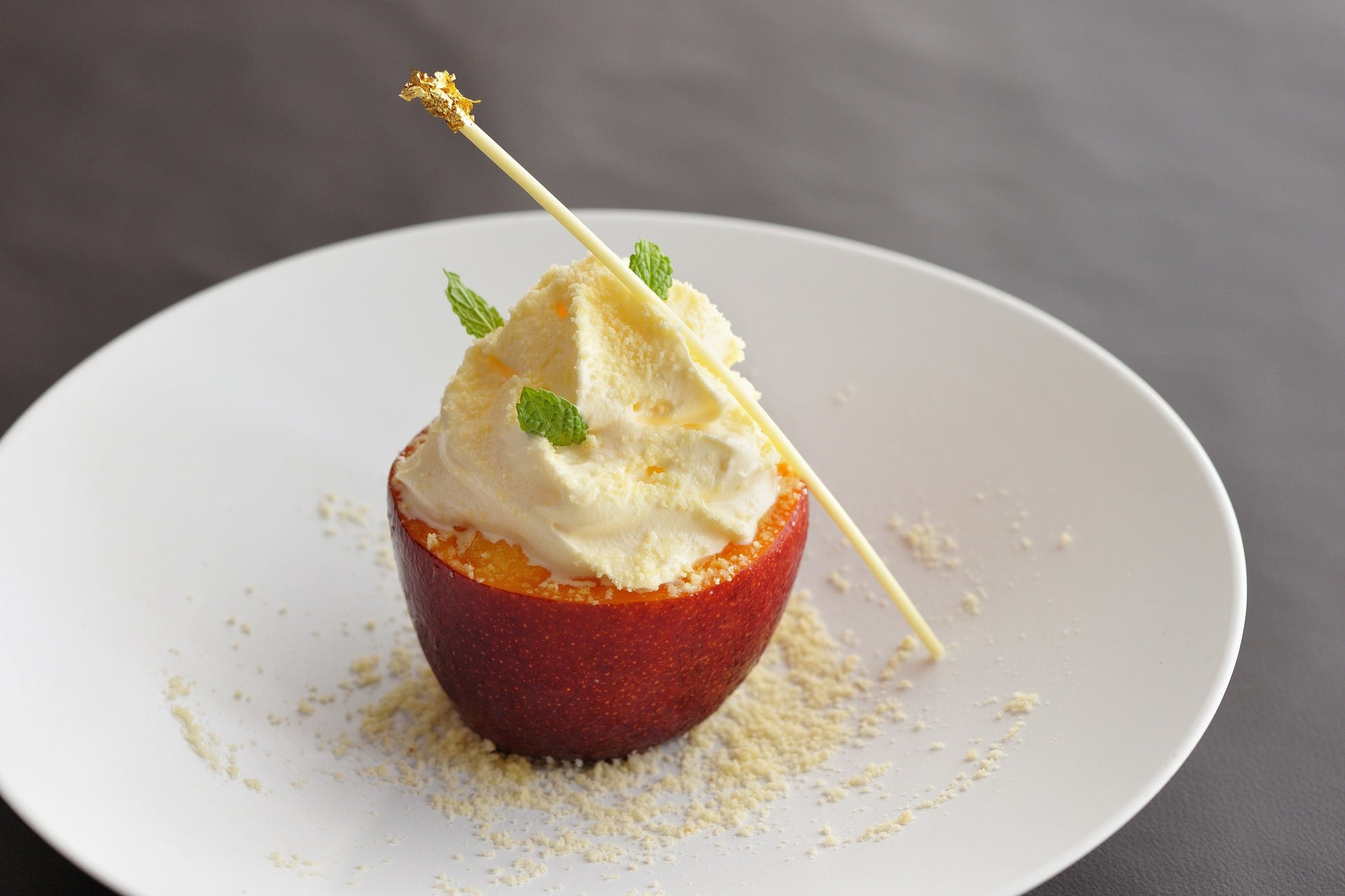 夏の王道の果物であるマンゴーを心ゆくまで堪能できるデザートです。甘みの強い完熟マンゴーをたっぷり使用しています。ショートケーキを再構築した仕立てで、スポンジはパウダーに、クリームはエスプーマ(ムース)にし、軽い口当たりが特徴です。エスプーマの中に忍ばせたジャスミンシロップや散らしたミントが爽やかに香り、飽きることなく楽しめます。