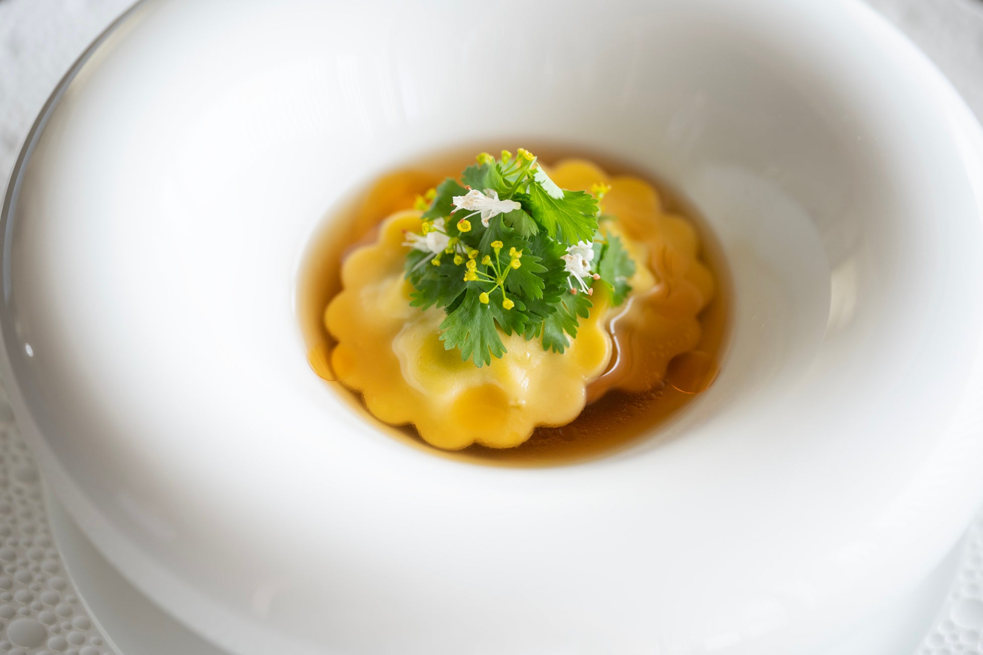 車エビを丸ごと使った、その甘みと旨味を存分に味わうことができる料理です。ラビオリの中には、ぷりっとした食感を残すために荒く刻んだ車エビの身と、爽やかに香るパクチーピューレを詰めています。さらに身、殻、ミソからとった出汁のコンソメを、ゲストの目の前で注いで完成です。雑味の無い透き通るような車エビの味わいを堪能できます。