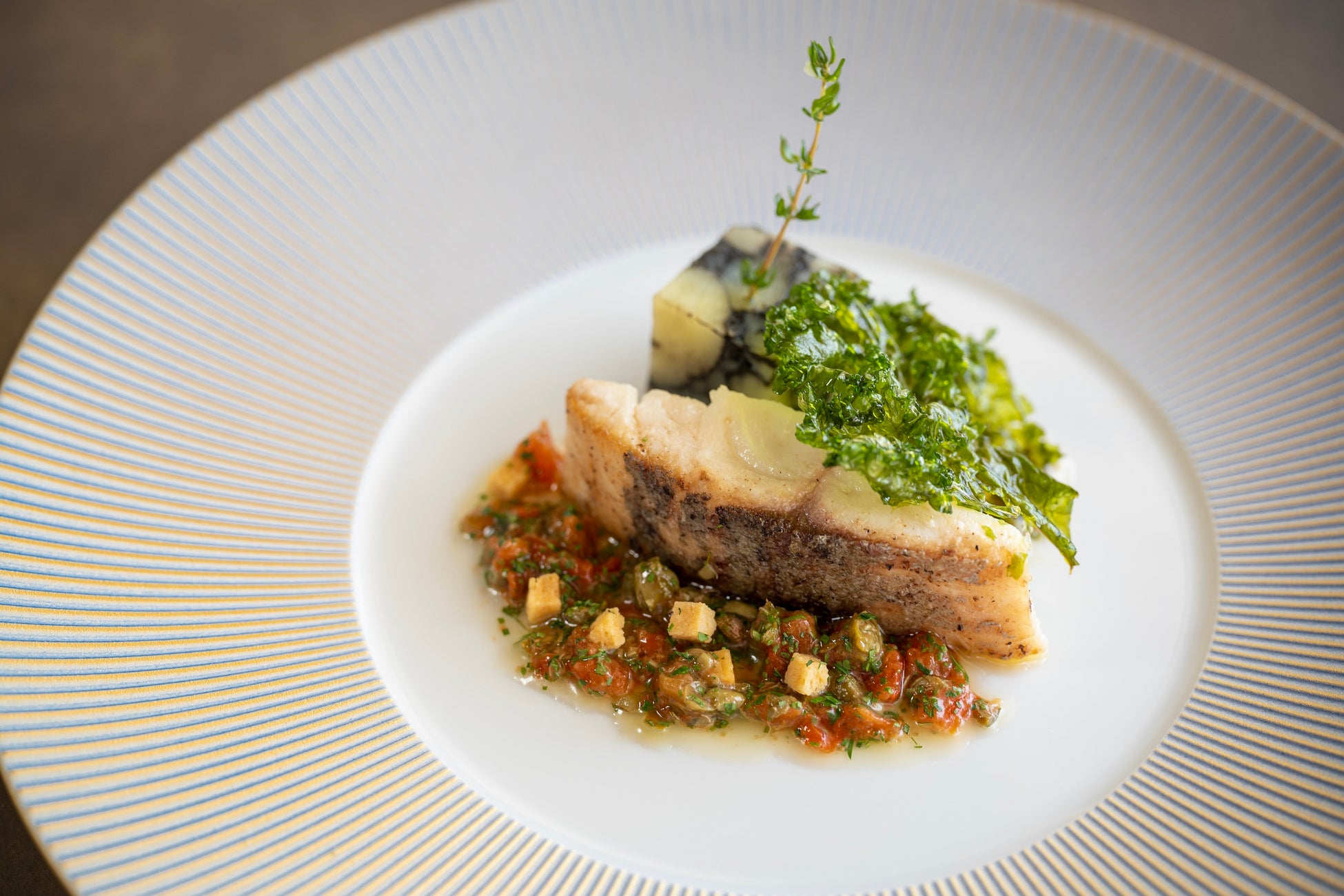島で「ガーラ」と呼ばれる、熱帯~亜熱帯に分布するアジ科の魚をクラシカルなフレンチ技法で調理した一品です。しっかりと火を入れたガーラに、焦がしバター、柑橘、トマト、ハーブを混ぜたソースを添えています。酸味の効いたコクのあるソースは、淡白な白身魚によく合います。