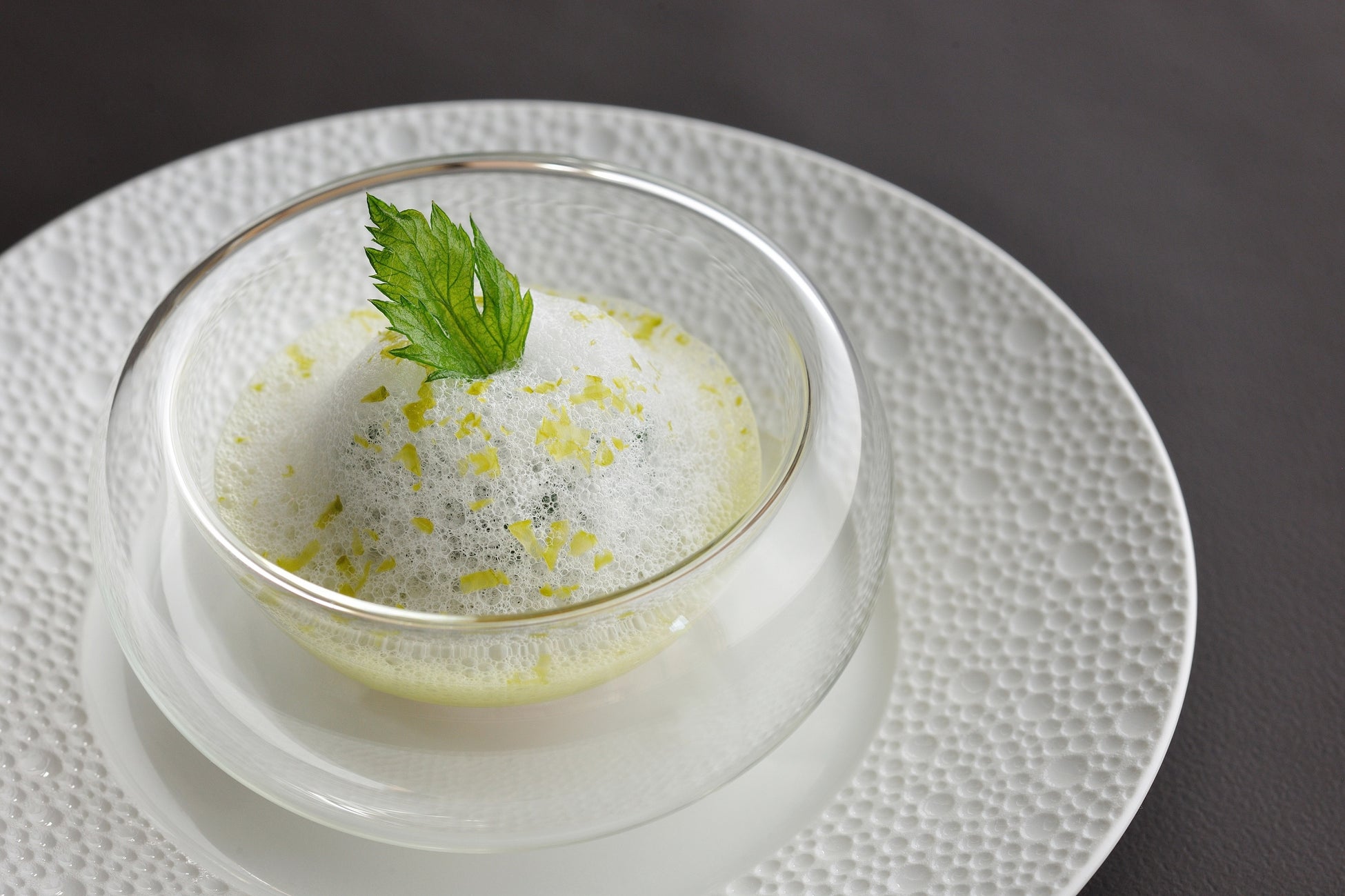 沖縄の方言で「フーチバ」はヨモギを、「ムーチー」は郷土料理の餅菓子を意味します。香り高いフーチバのペーストに本葛を合わせ、滑らかな食感のデザートを作りました。さらにシェーブルのエキューム(泡)と、ピスタチオのスープの味わいで和と洋が重なり合います。