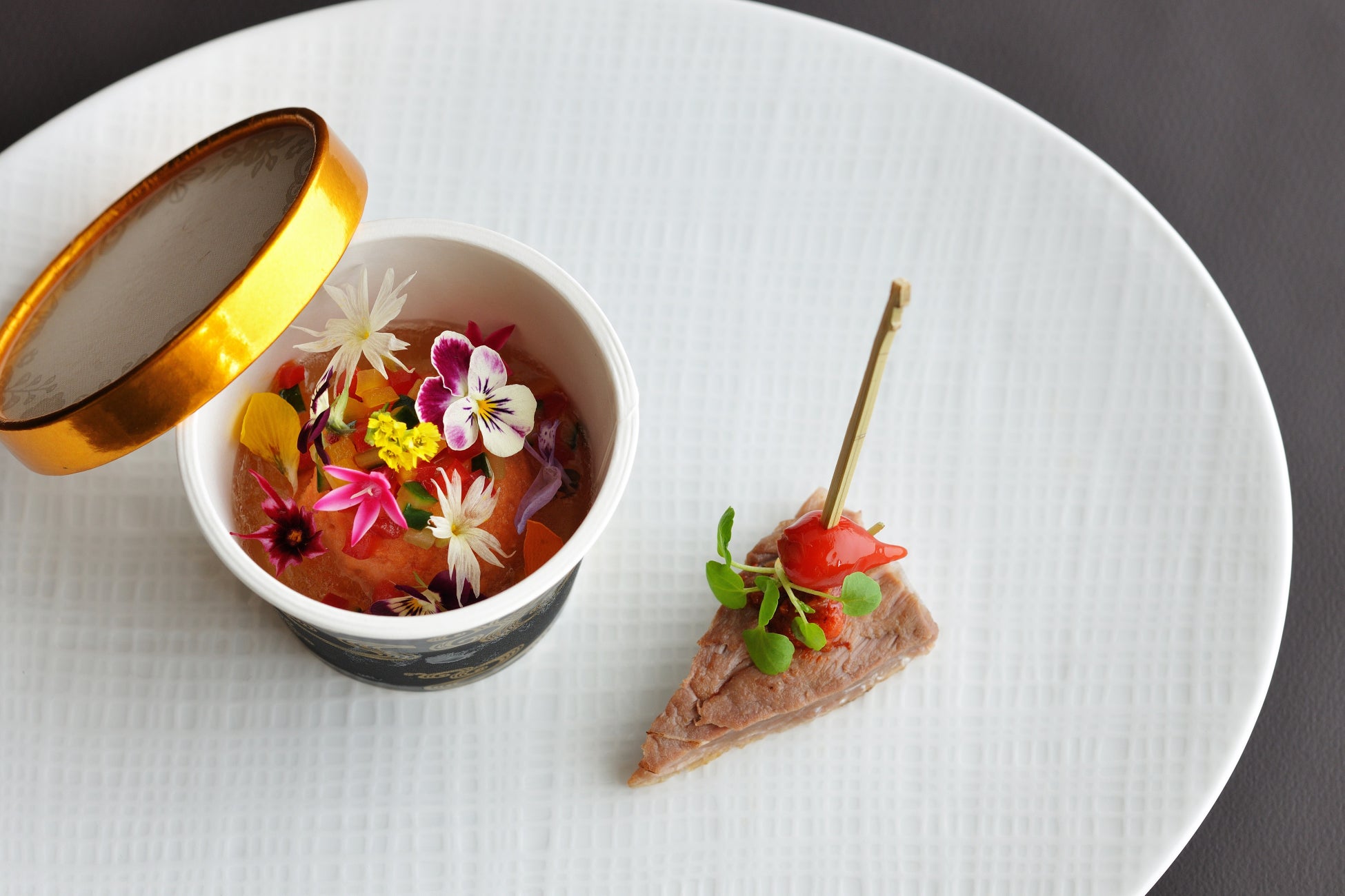 完熟トマトを使用したガスパチョをソルベに仕立て、食感も楽しめる冷製スープ。付け合わせはマグロのグリルです。爽やかなガスパチョの味わいと魚の旨味、そしてアクセントのハリッサが味わいを引き締め、全体をまとめあげます。
