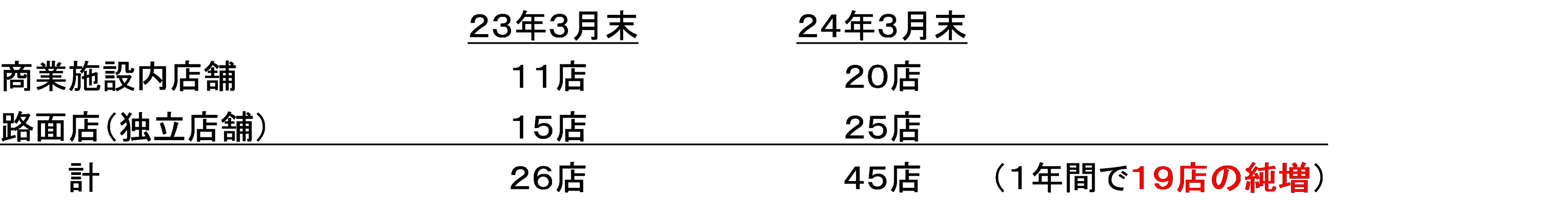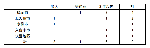 九州の複合店の第2号店は今年9月のイオンモール福岡店になります。福岡県は関東、関西及び東海3県と並ぶ複合店の重点出店地域です。複合店はまず福岡県に集中出店して、その後に九州全域に拡大していく予定です。今後の3年の県下での出店計画は下記の通りです: