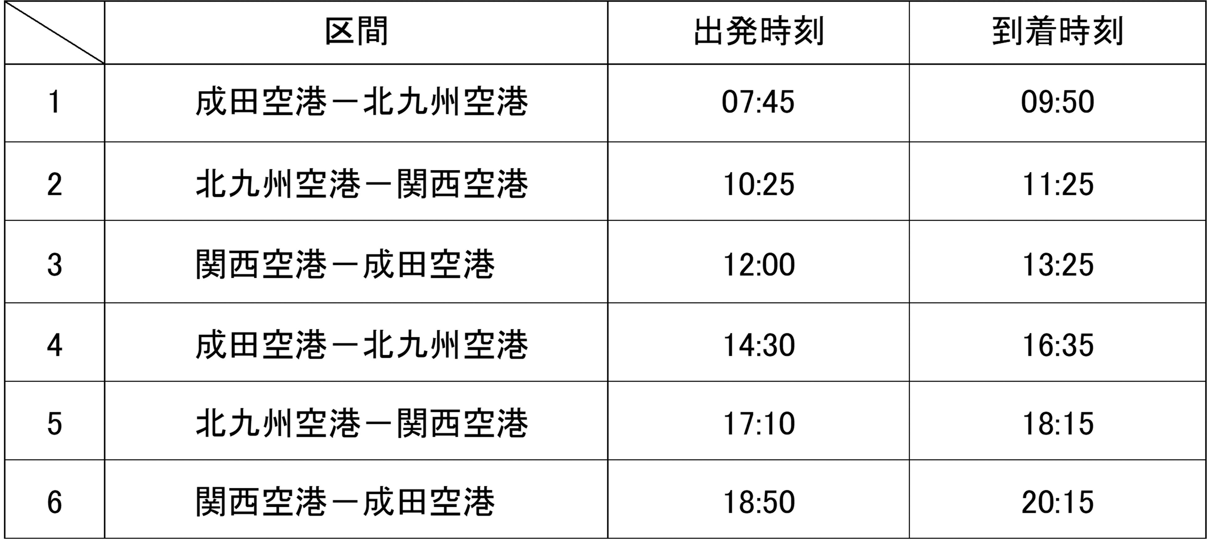 (1)運航路線:成田空港⇒北九州空港⇒関西空港⇒成田空港(2回/日)*1日あたり6区間を飛行。