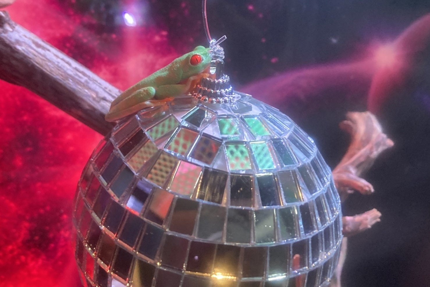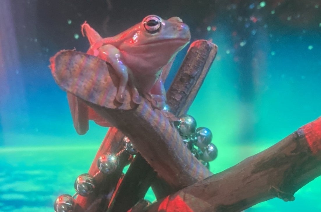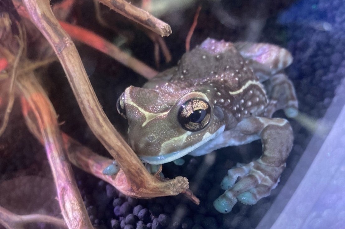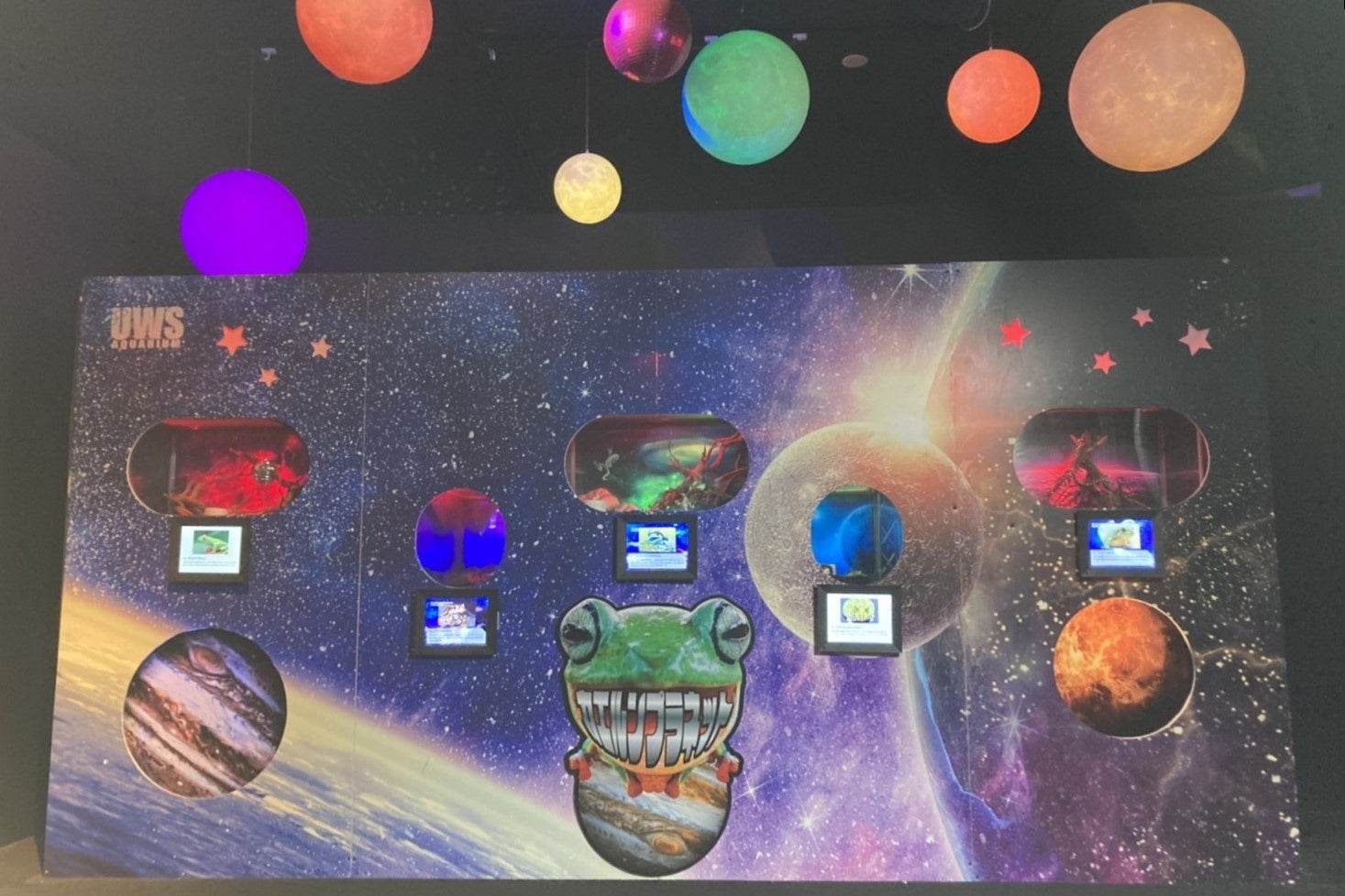 その特徴的な見た目から宇宙人を連想させる「イエアメガエル」「クランウェルツノガエル」「ジュウジメドクアマガエル」「アズマヒキガエル」「アカメアマガエル」の5種類のカエルを展示しました。宇宙旅行をテーマにした館内コンセプトに合わせ、惑星モチーフの水槽レイアウトを作成。広い宇宙のどこかにカエルだけが住む星が存在するような、そんなユニークなエリアとなっています。