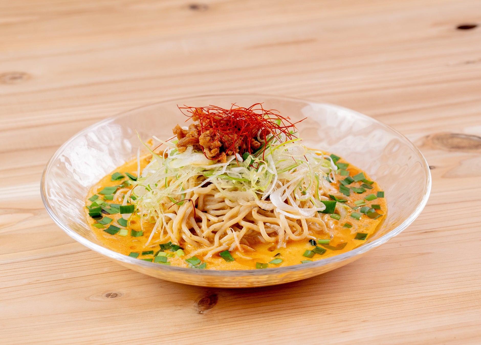 ひんやり豆乳スープと、中国の発酵調味料「醤(ジャン)」の旨味とコクのある辛さの担々麺。はしづめ製麺の、爽やかな風味と辛味を感じる生こしょうの練り込み麺を使用。