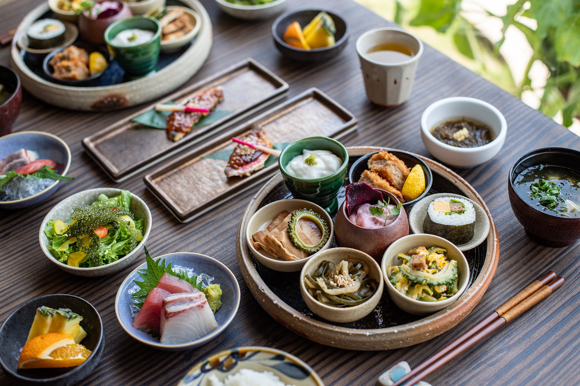 沖縄の味をふんだんに詰め込んだ「沖縄御膳」は全15品をそろえ、様々な沖縄料理をお楽しみいただきます。アーサの味噌汁や、ぐるくんの焼き味噌、海ぶどうサラダ、あぐー冷しゃぶ、など沖縄の身体にやさしい朝食です。