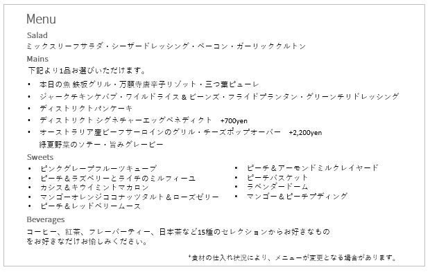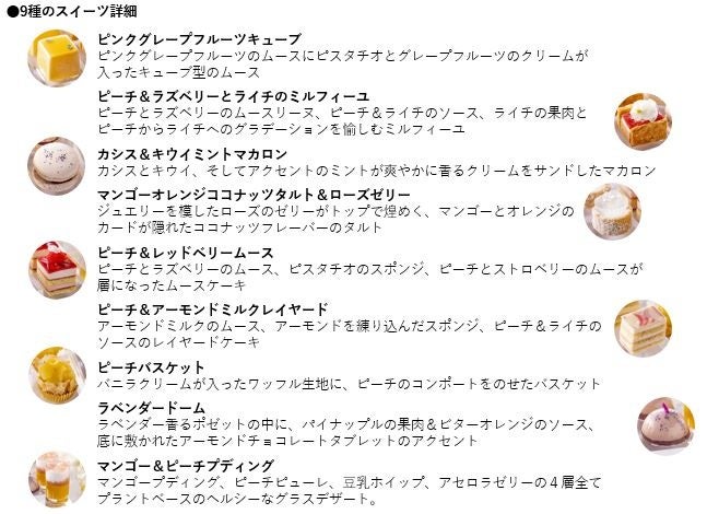 ディストリクトの人気ブランチメニュー5種から選べるメインと、ジルスチュアートのフレグランスからインスパイヤーされたスイーツがセットに。9種のスイーツは、エグゼクティブペストリーシェフ 諸戸清貴のクリエーションによる、サプライズを秘めた上質な味わい。マンゴー、ベリー、ライチなど、旬のサマーフルーツが満載の、さわやかでトロピカルな味わいのアフタヌーンティーをお届けします。