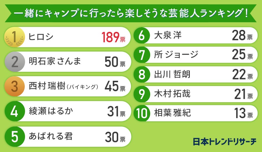 一緒にキャンプに行ったら楽しそうな芸能人で第1位となったのは、ヒロシさんで189票でした。