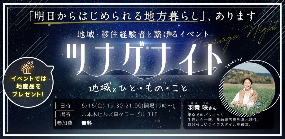 【都内在住者向け】移住・多拠点居住のロールモデルと繋がることでリアルな地方の魅力に触れる『ツナゲナイト』を開催! ~6/18(金)19時 @六本木~
