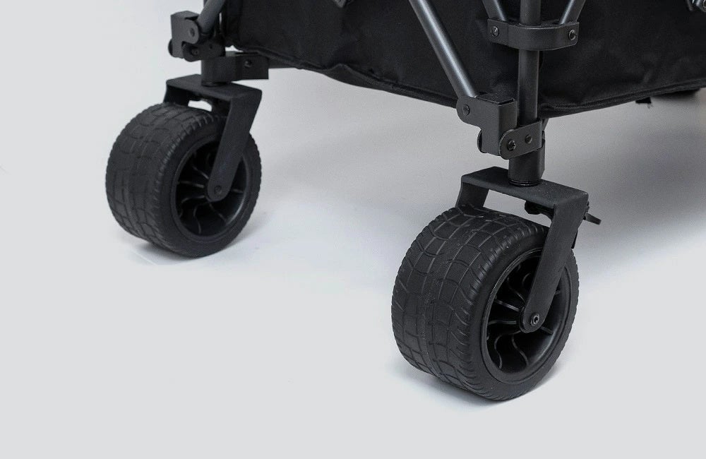 各タイヤに採用されたベアリングによるスムーズな回転が特徴です。そのため、一般的な同型のワゴンに比べて軽くスムーズに操作でき、女性はもちろんお子様でも楽々運搬可能です。さらに8.5cmの極太タイヤは、段差や砂地も難なく走破してくれます。