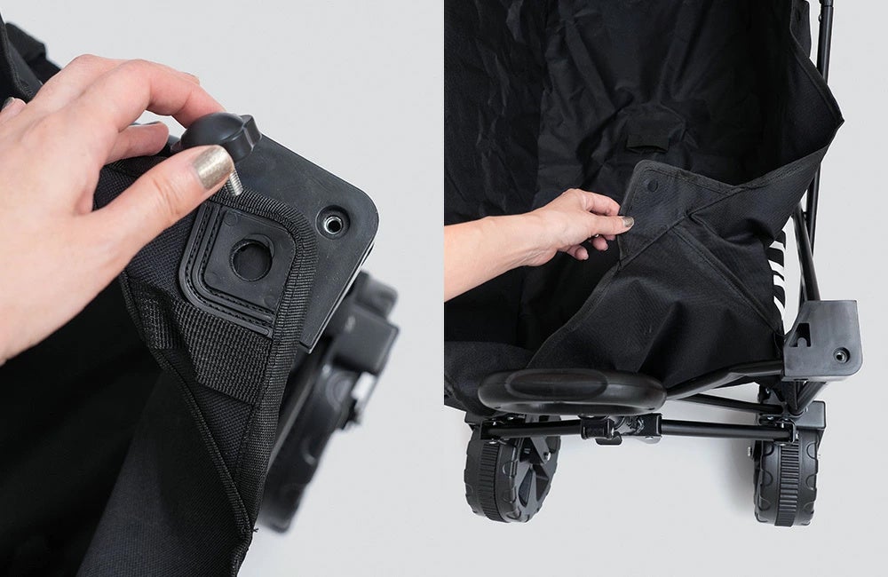 シートはベルクロでフレームに固定しているため、容易に取り外しができます。洗えるのでホコリや泥汚れも気にせず使用でき、またすぐに乾くポリエステル素材なので扱いやすいのが特徴です。