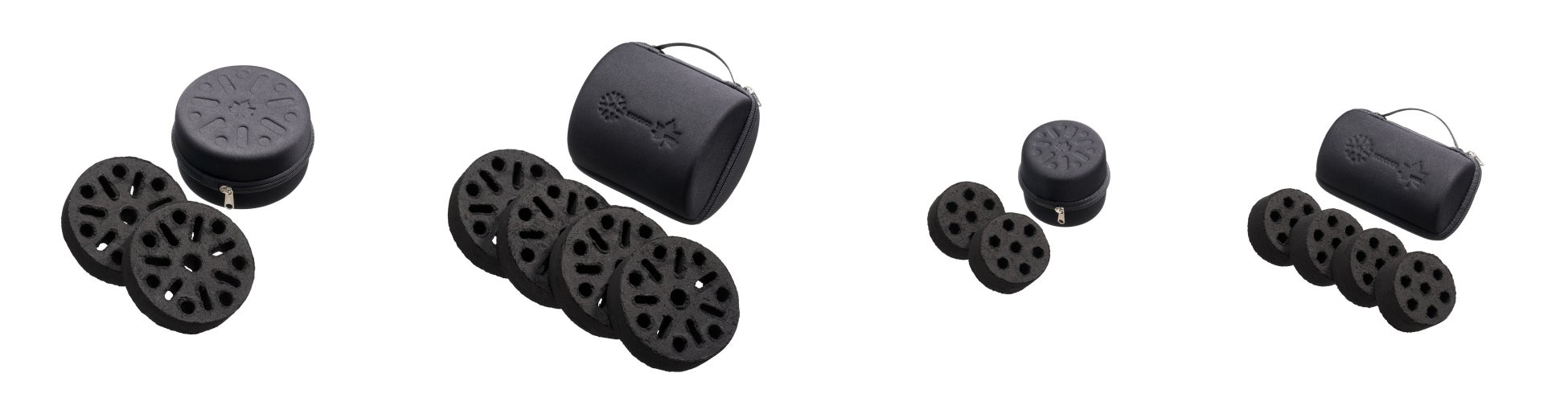 大人数でのBBQに最適なサイズの「エコココロゴス・ラウンドストーブ」と、テーブルグリルとの相性が抜群な「エコココロゴス・ミニラウンドストーブ」のそれぞれに、2個収納できるタイプと4個持収納できるタイプの2種類のケースを展開します。アウトドアシーンの人数や所要時間に合わせ、必要な分だけの燃料をケースに入れて持ち運ぶことで、キャンプやBBQで出るゴミの削減にもつながります。