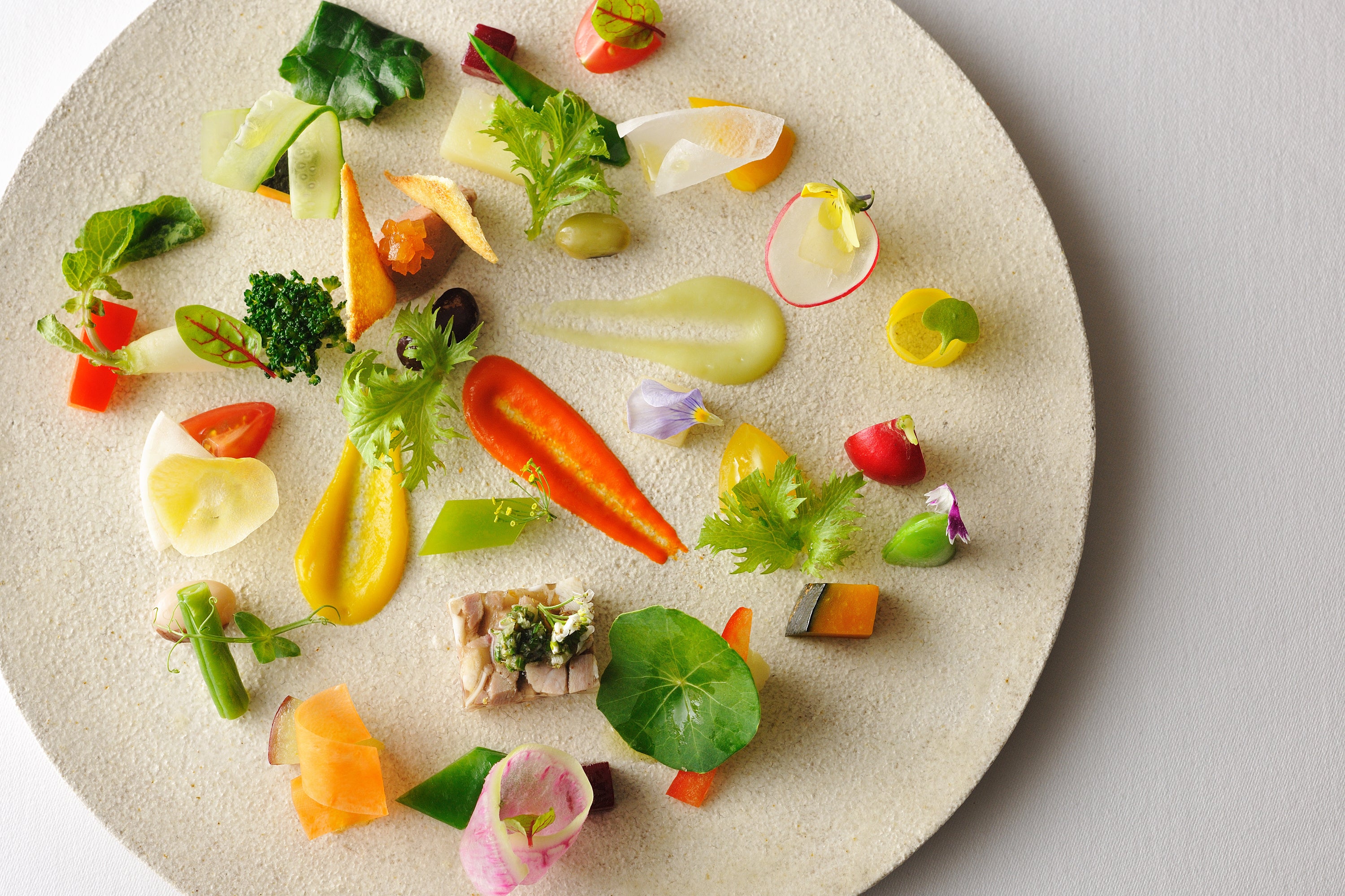 30種類の野菜を使ったOTTO SETTEを代表する一品です。夏野菜のトマト、きゅうり、オクラをはじめとした野菜を、爽やかなカボスのコンディメントと合わせました。イタリアの郷土料理のソップレサータ(*1)や鶏レバーパテのブルスケッタなど、多彩な味わいを楽しめます。色鮮やかな赤パプリカやバターナッツのソースとともに提供します。