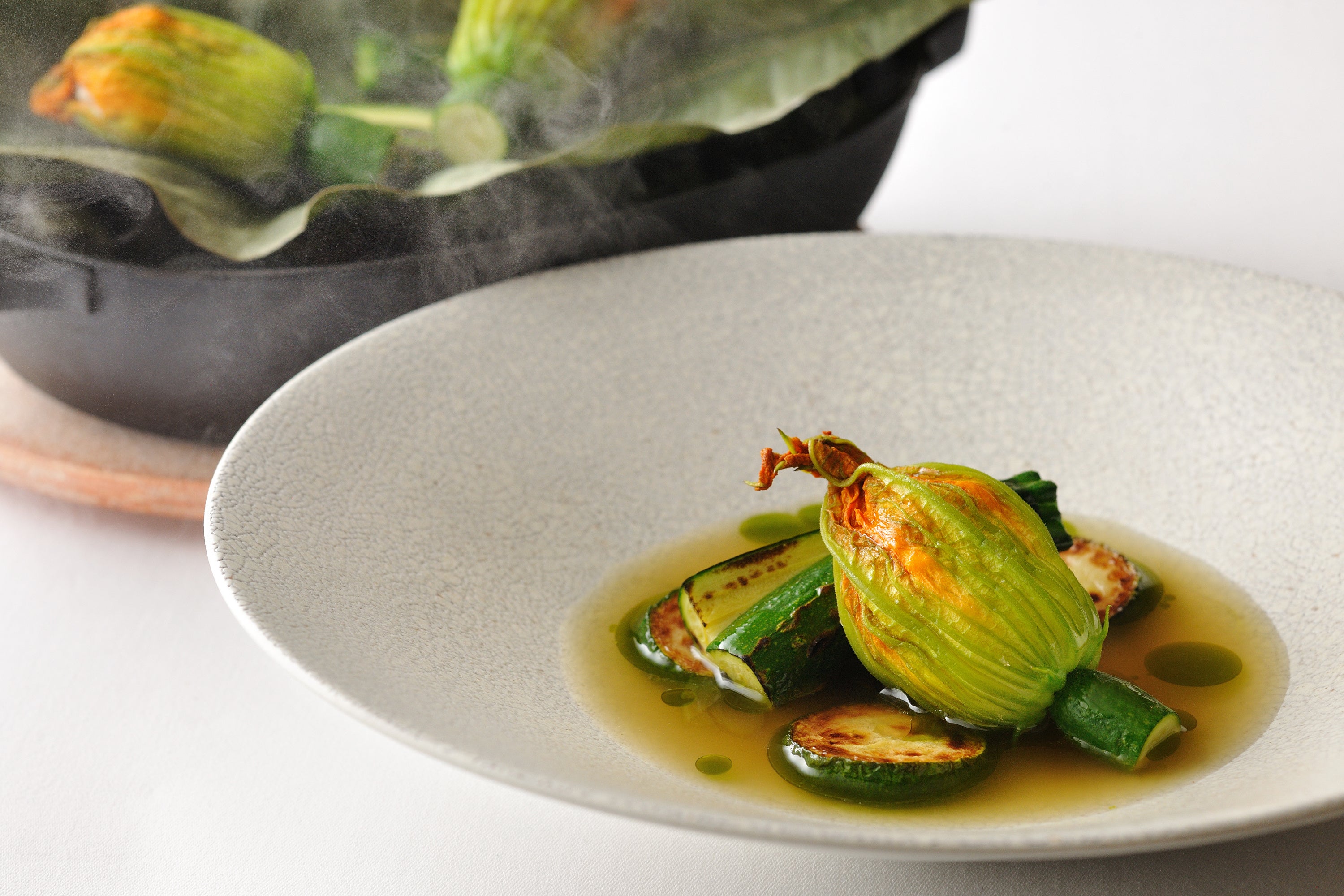 イワナを花ズッキーニで包み、ふっくらと蒸し上げました。香ばしく焼き上げた夏野菜のズッキーニと共に提供します。イワナと川海老のスープに、ミントの香りを纏わせたさわやかな味わいを楽しめます。