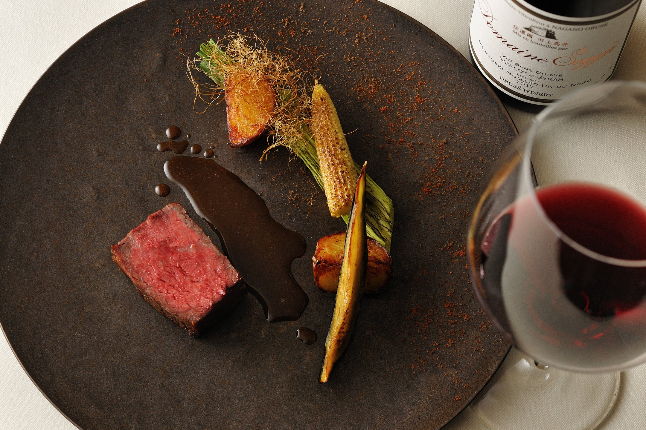 ローストした牛肉に、メルローの果実味とシラーの白コショウのようなスパイシーさがアクセントとなり、肉の旨みを引き出し、味噌のソースの旨みに相乗し、まろやかに融合します。料理をワインが一体となり心地良い余韻を残します。
