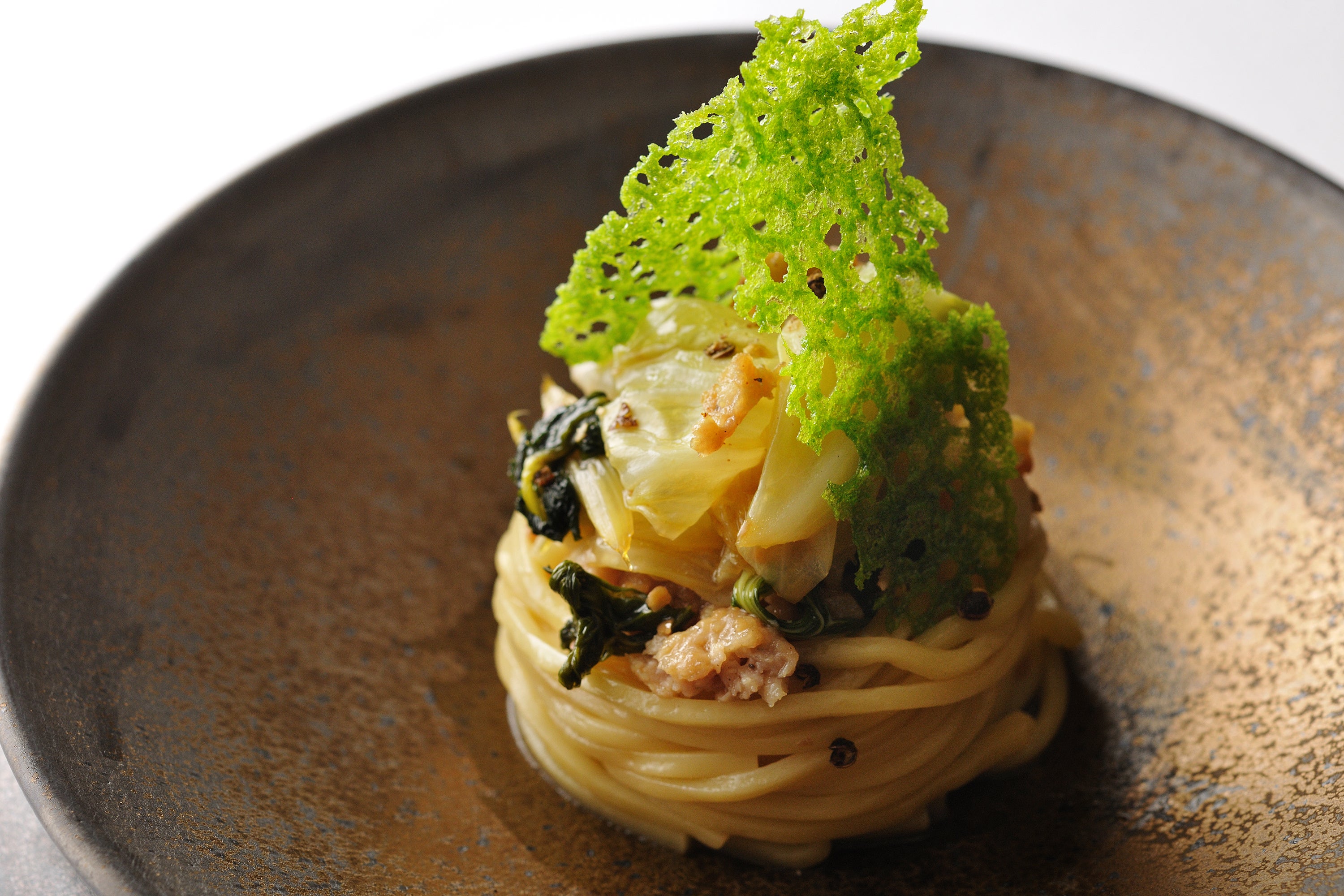 柔らかい食感と甘みが特徴の夏のキャベツをふんだんに使い、もちもちとした食感が特徴のトンナレッリと合わせたパスタ料理です。鶏肉のサルシッチャの旨味がしみ込んだキャベツと、香り豊かなセロリのクロッカンテがアクセントとなっています。