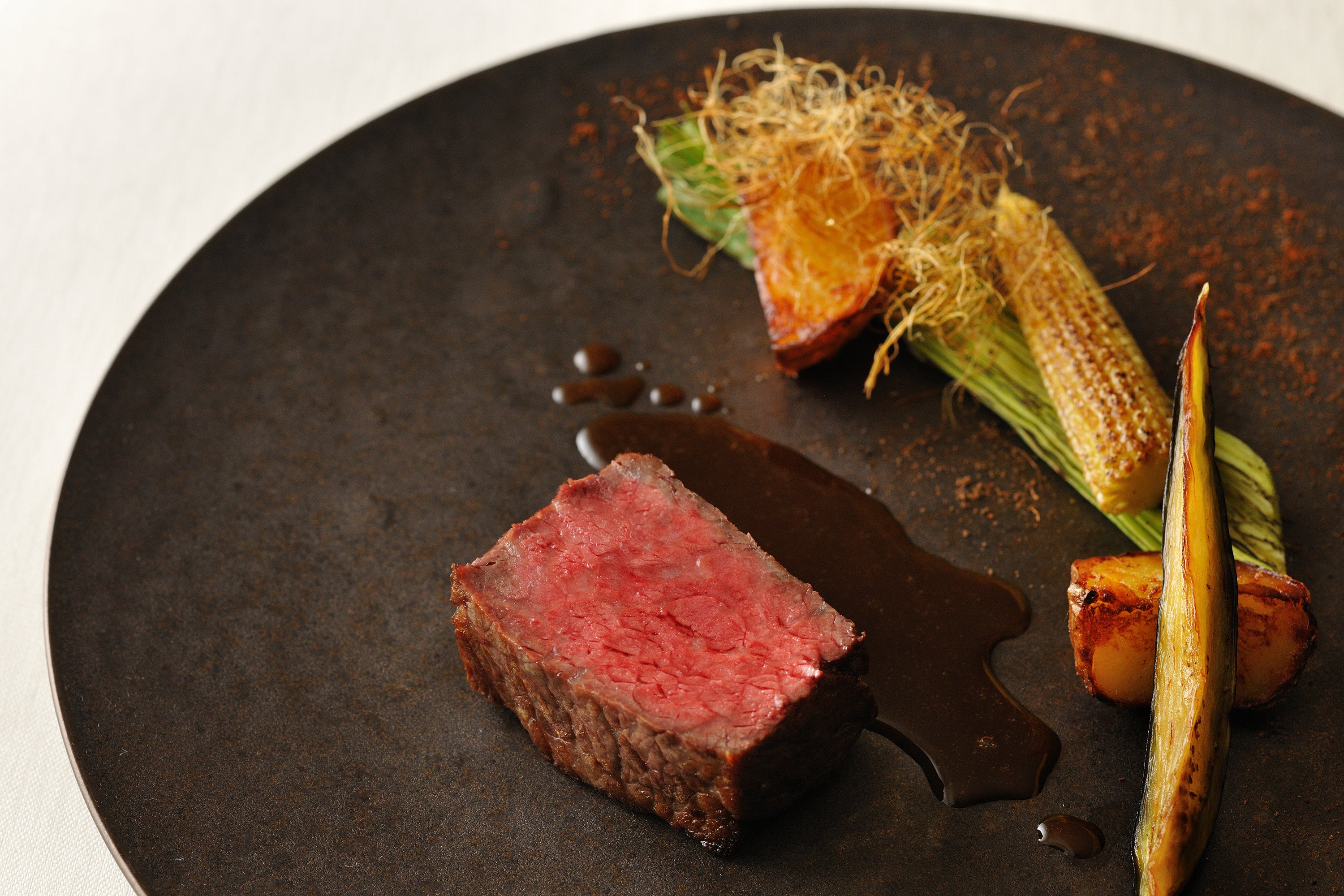 香ばしく焼き上げた牛肉に、味噌を効かせたソースと味わう一品です。付け合わせには、葉付きのヤングコーンとナスのロースト、ジャガイモのトリフォラート(*4)を組み合わせました。牛肉のローストは旨味が凝縮され、噛むほどに味わいが広がります。