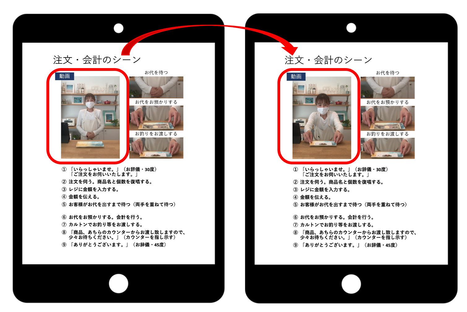 当サービスは、このような失敗体験から生まれました。マニュアルにお手本となるサービスの動画を組み込むことで、会社や店舗が目指す接客サービスを可視化します。当時の私のように教える側に教育スキルが不足していても、教わる側は動画のイメージを元に反復学習をすることができる為、効果的にスキルの習得へ繋がります。