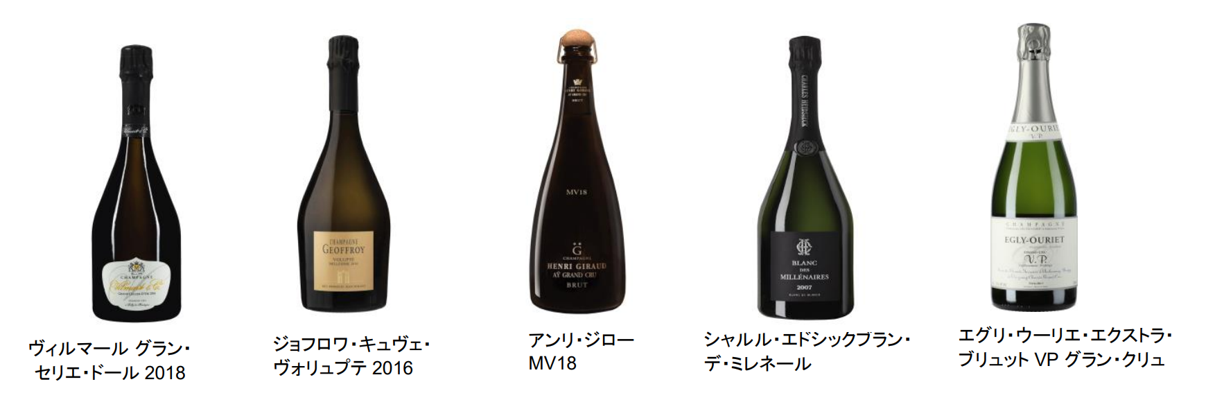 本キャンペーンでは、合計5種類の新しいシャンパン銘柄が2ヶ月ごとのローテーションで提供される予定です。小規模生産者によるシャンパンのグロワー・シャンパーニュ(Grower Champagne)の中でも特別なシャンパン「ヴィルマール グラン・セリエ・ドール 2018」からスタートし、以下のシャンパン銘柄が順次機内で提供される予定です。[1]
