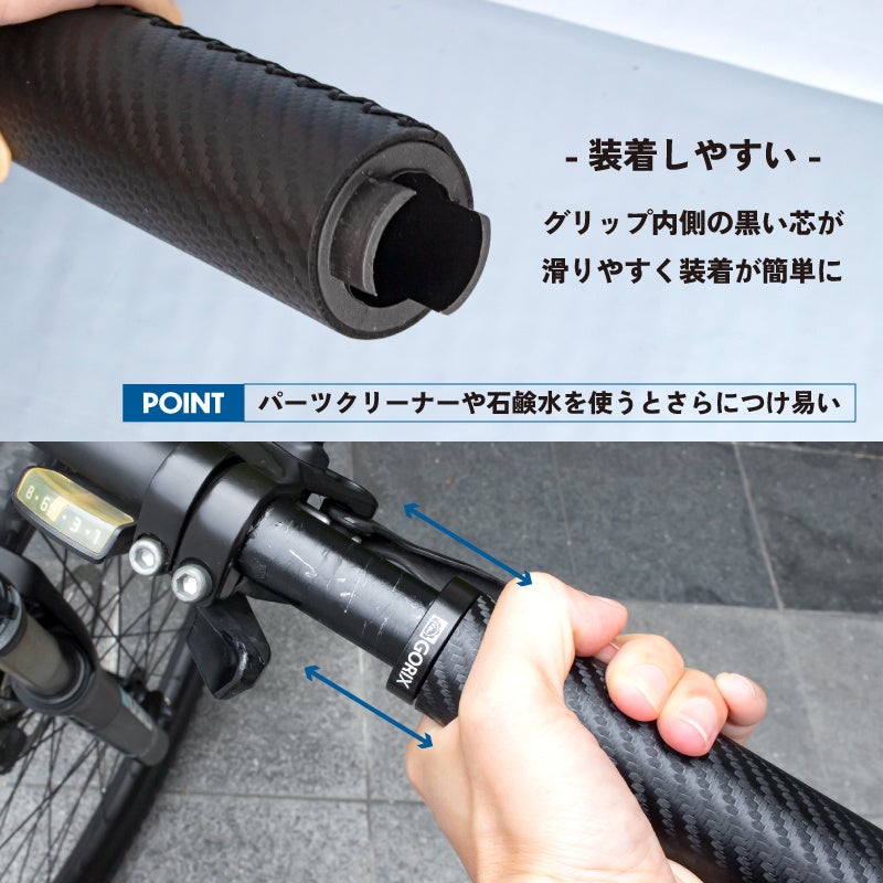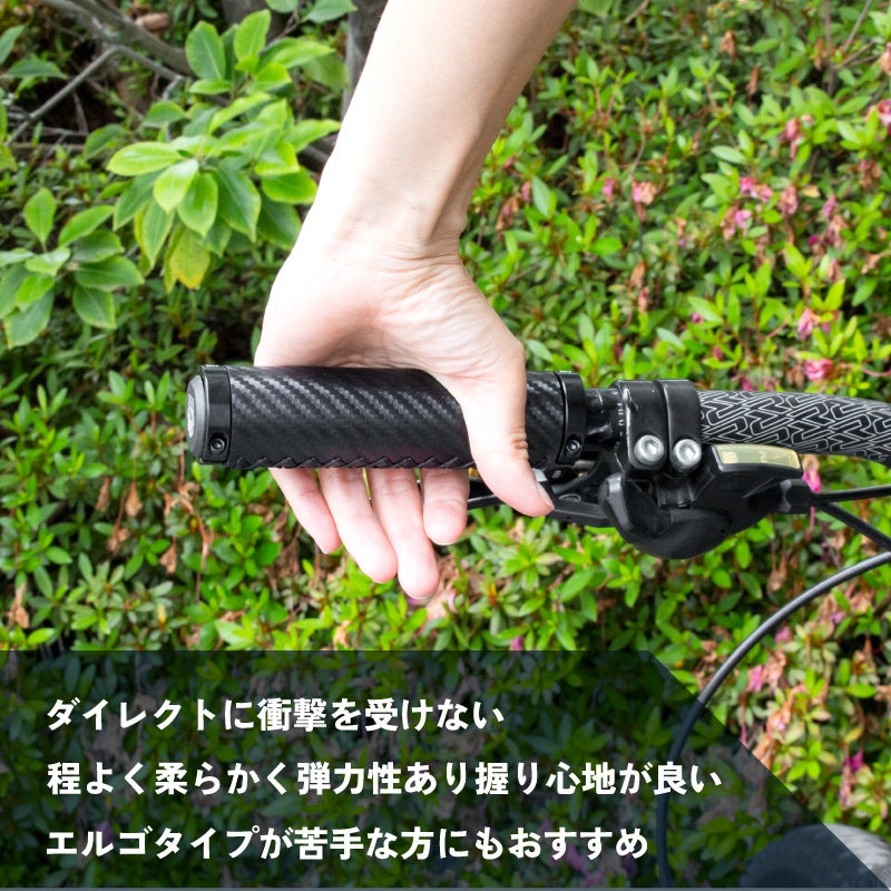 カーボン調柄が落ち着いた印象をあたえる自転車用グリップです。