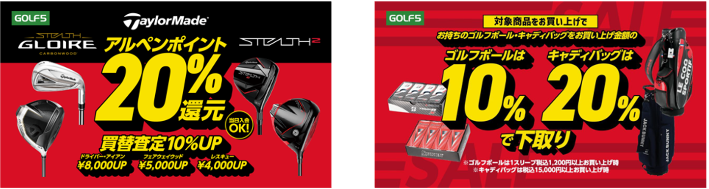 アルペングループメンバーズ限定で、テーラーメイドのステルス2・ステルスグローレはアルペンポイント20%還元を行います。買い替えなら通常査定金額より10%アップ、さらにドライバー・アイアンは8,000円、フェアウェイウッドは5,000円、レスキューは4,000円アップにて買取いたします。その他、対象の新品クラブお買い上げ時にアルペンポイントを10%還元いたします。また、ゴルフクラブ買取を強化。通常査定金額より10%買取価格をアップいたします。ドライバー・アイアンはさらに3,000円、フェアウェイウッドとユーティリティは2,000円、パター・ウェッジは1,000円アップにて買取いたします。