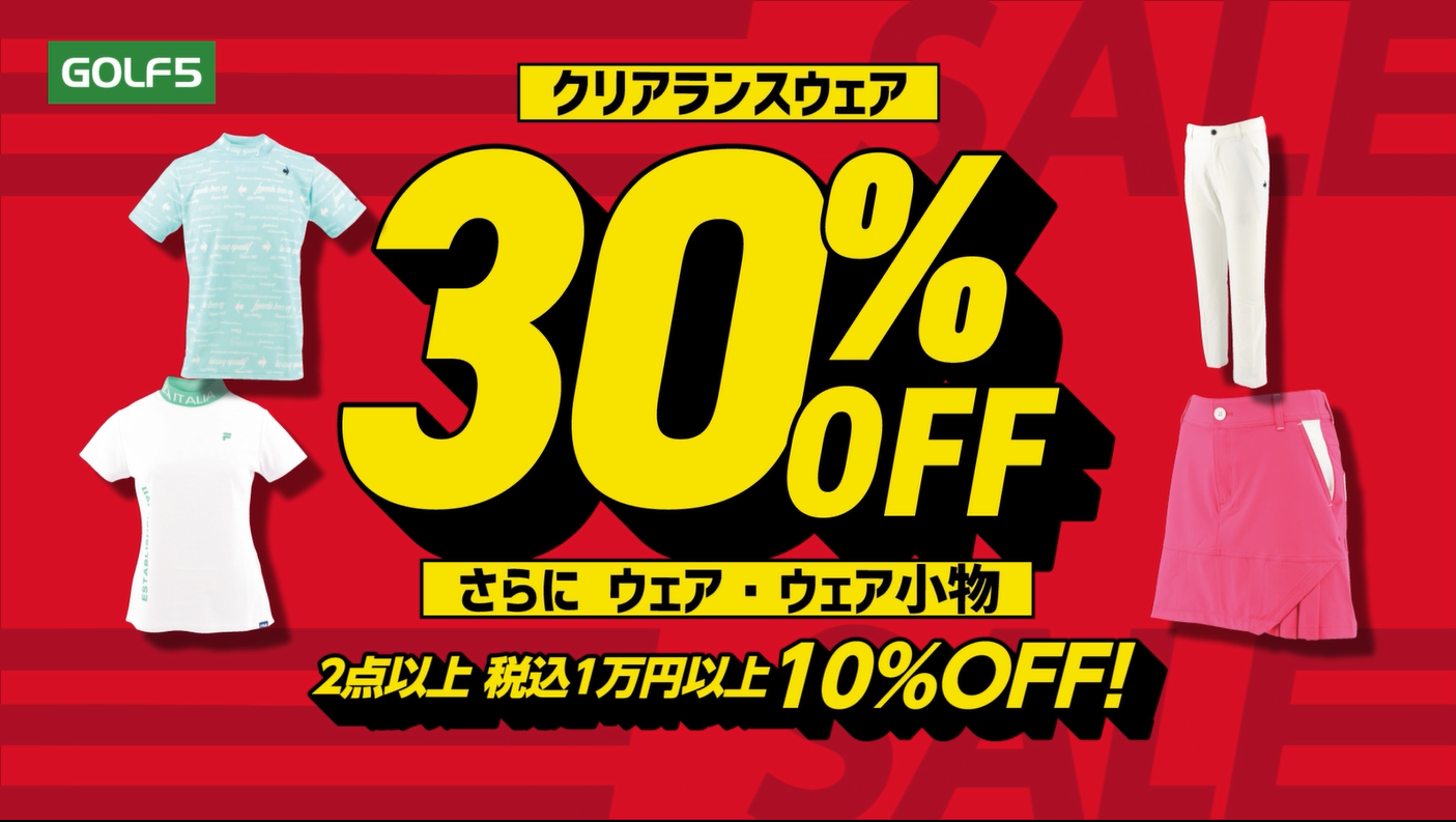春夏ウェアは早くもクリアランス30%OFFに。さらにゴルフウェア・ウェア小物を2点以上税込1万円以上後購入で10%OFFとなるお買得キャンペーンをご用意いたしました。夏物ウェアはこの機会にまとめ買いをしてみてはいかがでしょうか。