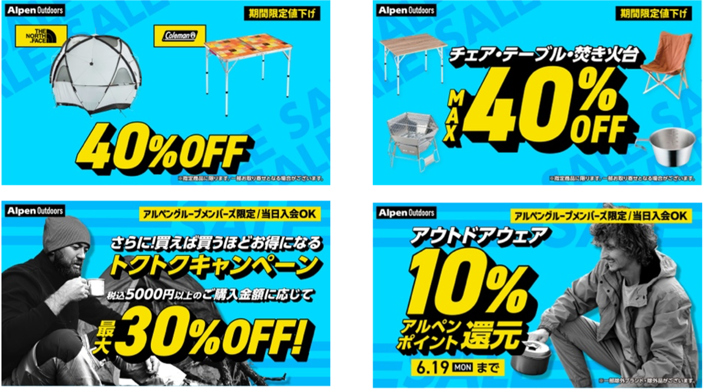 そして、この夏レジャーを楽しみたい方に向けて「キャンプ用品トクトクキャンペーン!」を開催いたします。アルペングループメンバーズ限定で、税込5,000円以上のお買上合計金額に応じて最大30%OFFになるお得な企画となっております。