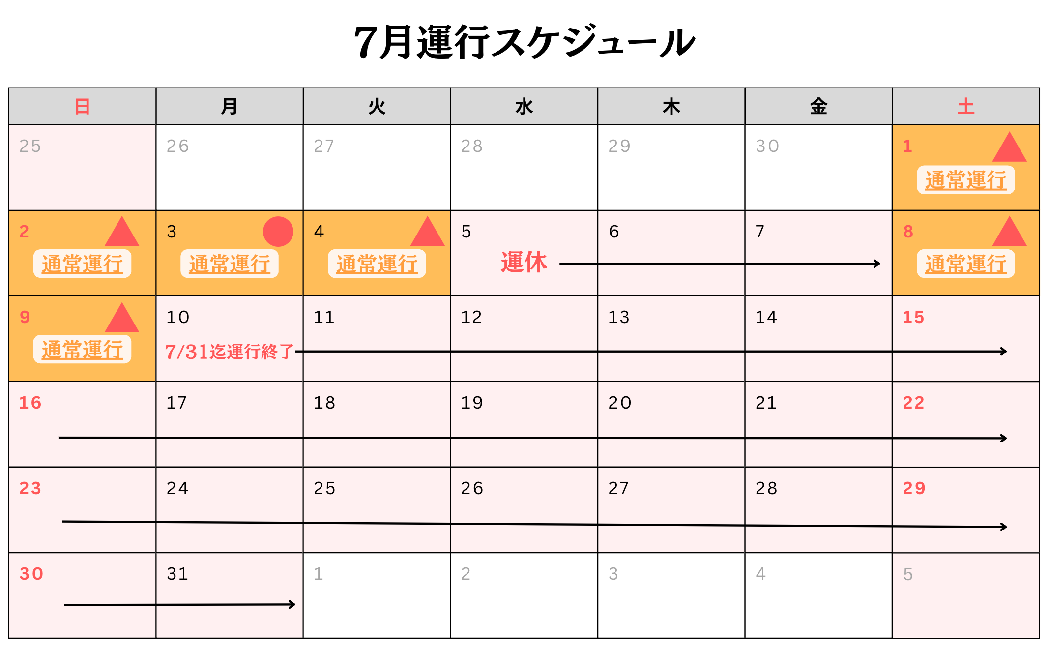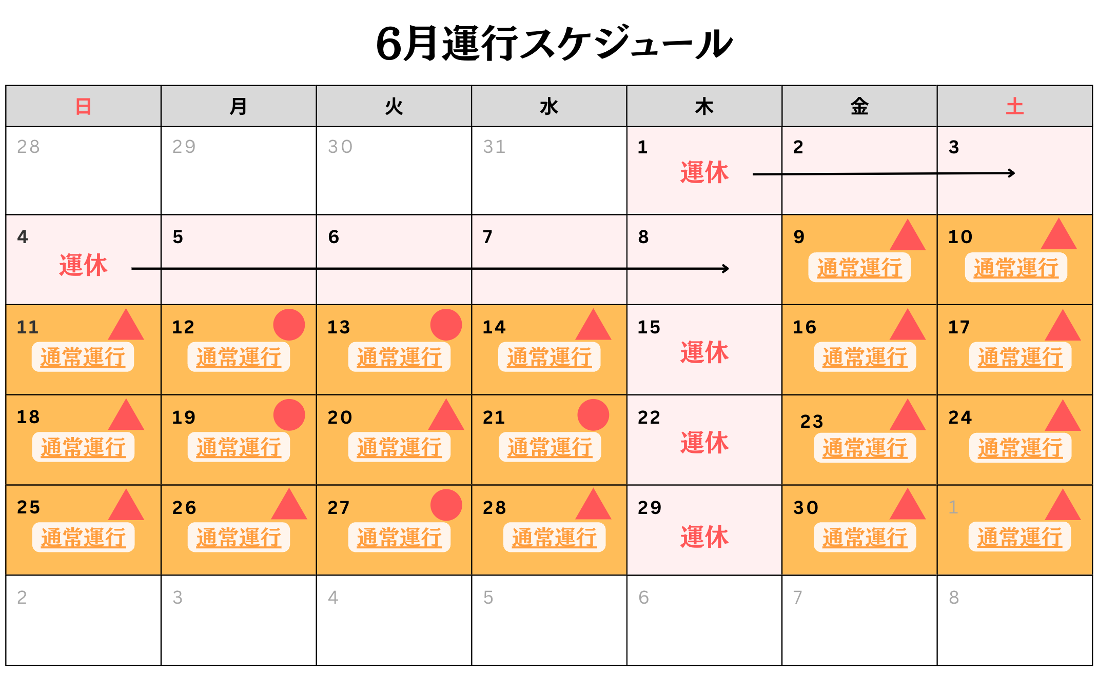 6月運行スケジュール:6/9〜6/14、6/16〜21、6/23〜6/28、6/30、7/1〜7/4、7/8〜7/9