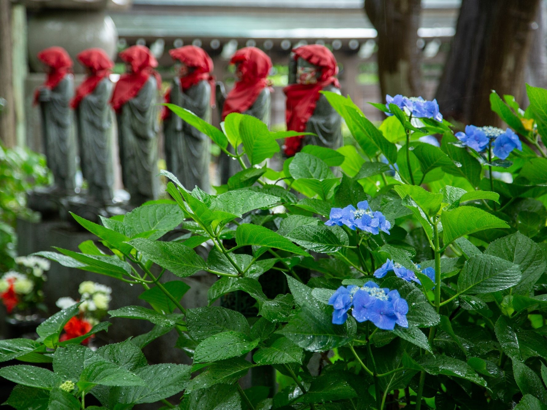 赤い頭巾を被った地蔵と、青々と咲くあじさいのコントラストが目を引きます。