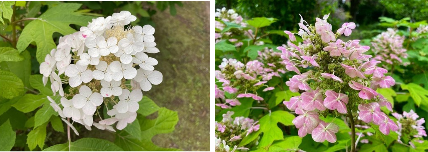 この時期は、たくさんのあじさいが咲き誇り、中でも「カシワバアジサイ」は特徴的な品種として人気です。最初は真っ白な色をしていますが、時間が経つとピンク色のように変化するため、移り変わりも楽し むことができます。
