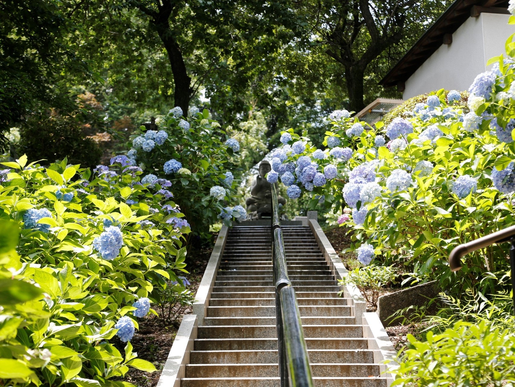 細い階段を上りきると、両脇を埋め尽くすほどの青いあじさいが群生しています。