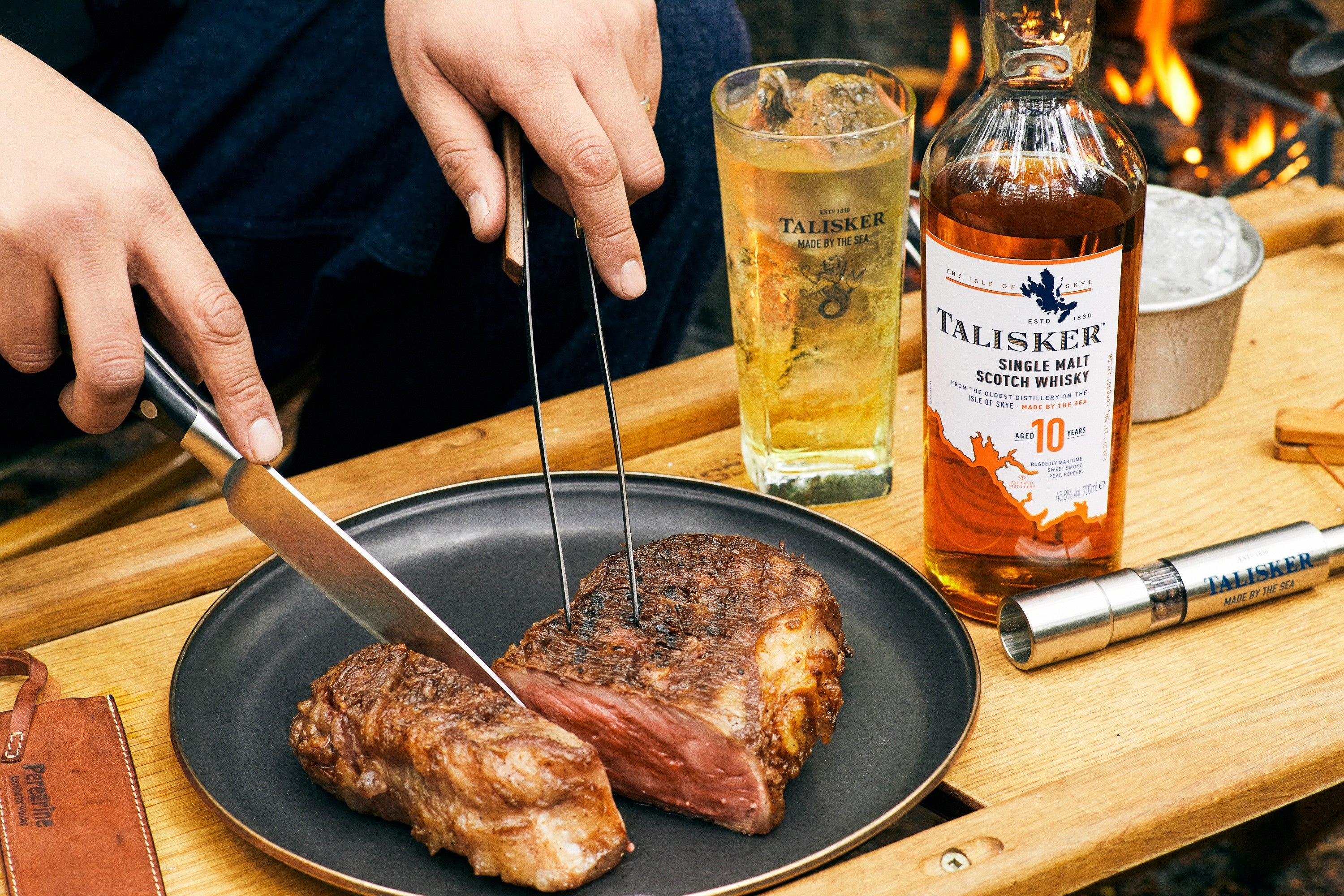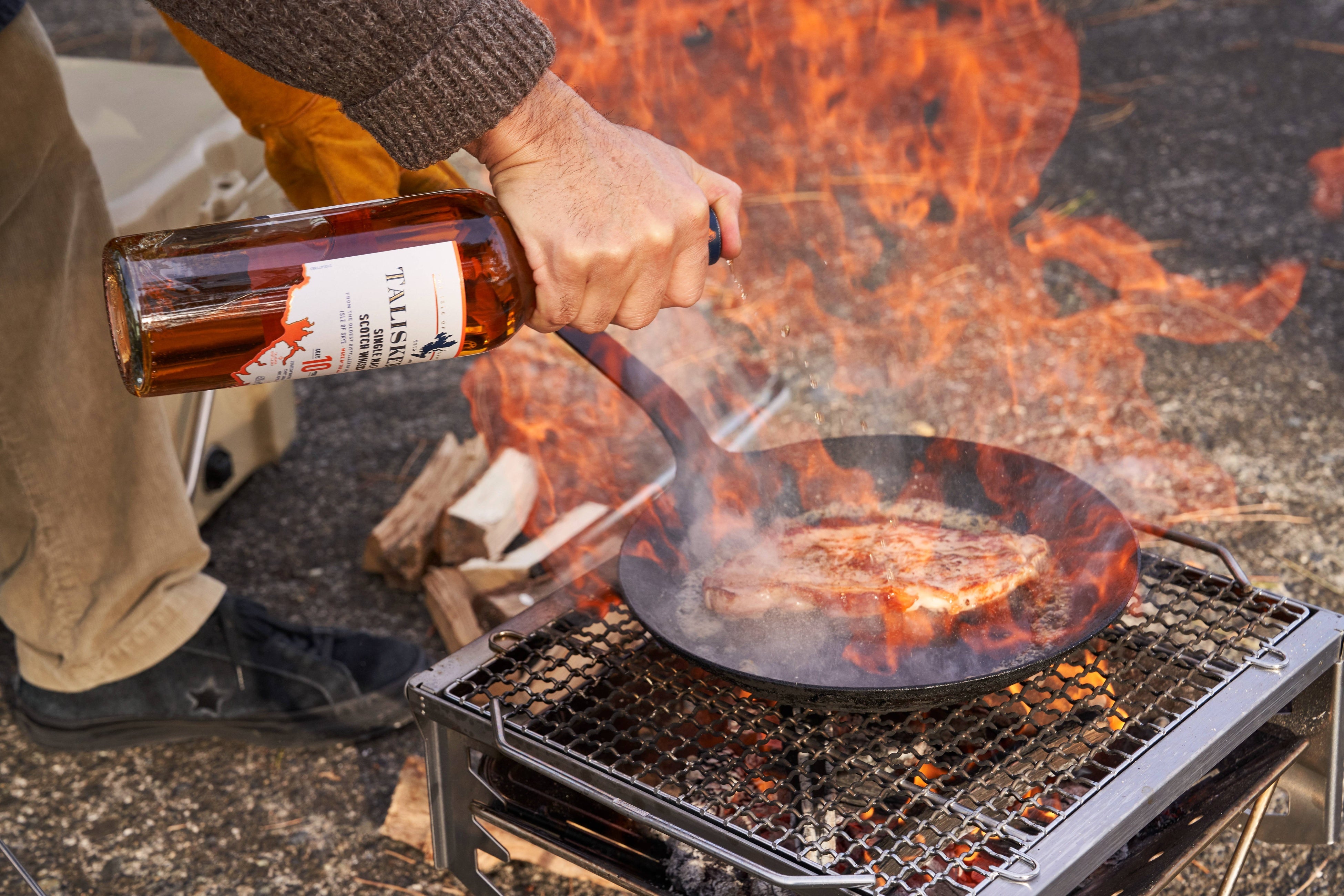 タリスカーがもつ潮風と黒胡椒の香り、スモーキーな味わいは、肉料理と宿命的な好相性。肉の力強い旨みを更に引き立て、アウトドアでも抜群の存在感を発揮します。大自然の中で豪快に調理した肉料理と、スカイ島の自然そのものを体現したタリスカーの、宿命的ともいえるペアリングが、アウトドアという非日常をより特別な体験へと演出します。