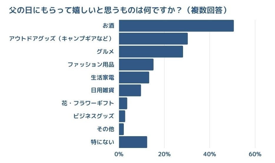アウトドアの醍醐味といえば、大自然のなかで料理やお酒を楽しむこと。実際に今回の調査では、80.6%の方がアウトドアでの料理やお酒にはこだわりたいと回答。「家では作れないワイルドな料理」や「とっておきのお酒を飲む」など、非日常を楽しむためのこだわりの声が多く得られました。そんな“アウトドア派の父”が、父の日にもらって嬉しいと思うプレゼントについては、50.6%と最も多くの方が「お酒」と回答。「娘や息子にもらうものは格別」など、感謝のこもったプレゼントが「父のとっておき」になることが分かりました。