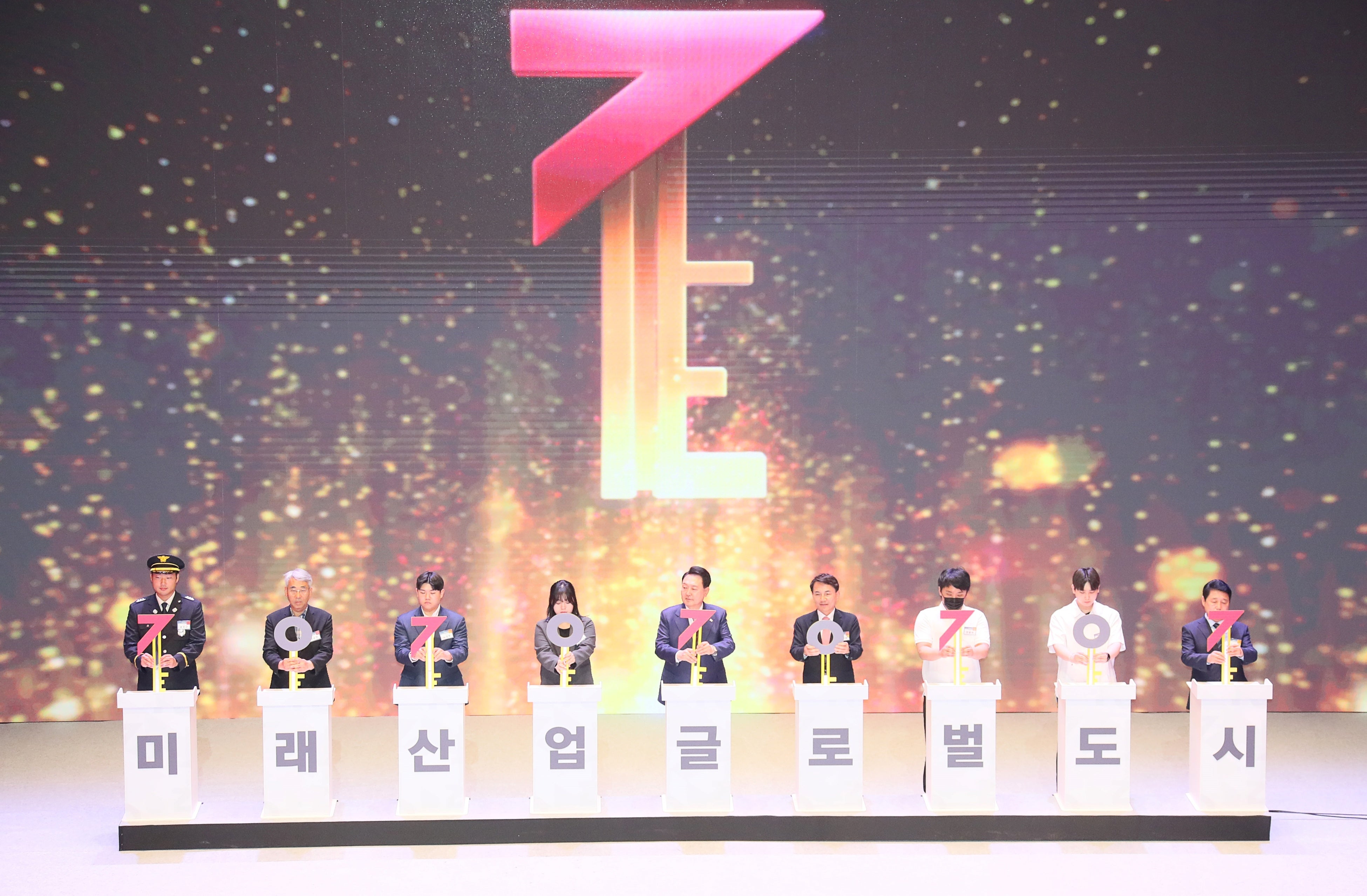 新しいロゴマークは、上昇イメージのグラフィックモチーフを元に未来産業のグローバル都市に進む能動的でダイナミックな姿を表現し、全国の広域地方自治体で初めてハングルを活用しました。