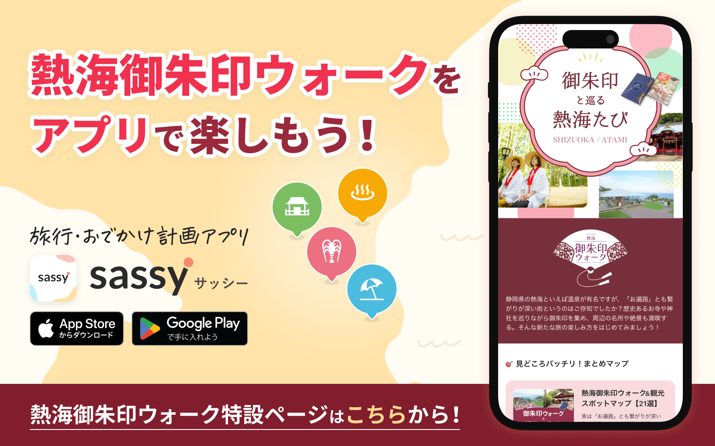 旅行・おでかけ計画アプリ「sassy」で「熱海御朱印ウォーク」をお楽しみいただけます。Webでもご覧いただけますが、アプリをダウンロードすると、熱海御朱印ウォークのしおりを自由にカスタマイズできるなど、さらに便利な機能が使えるようになります。下のリンクから、ぜひお楽しみください!