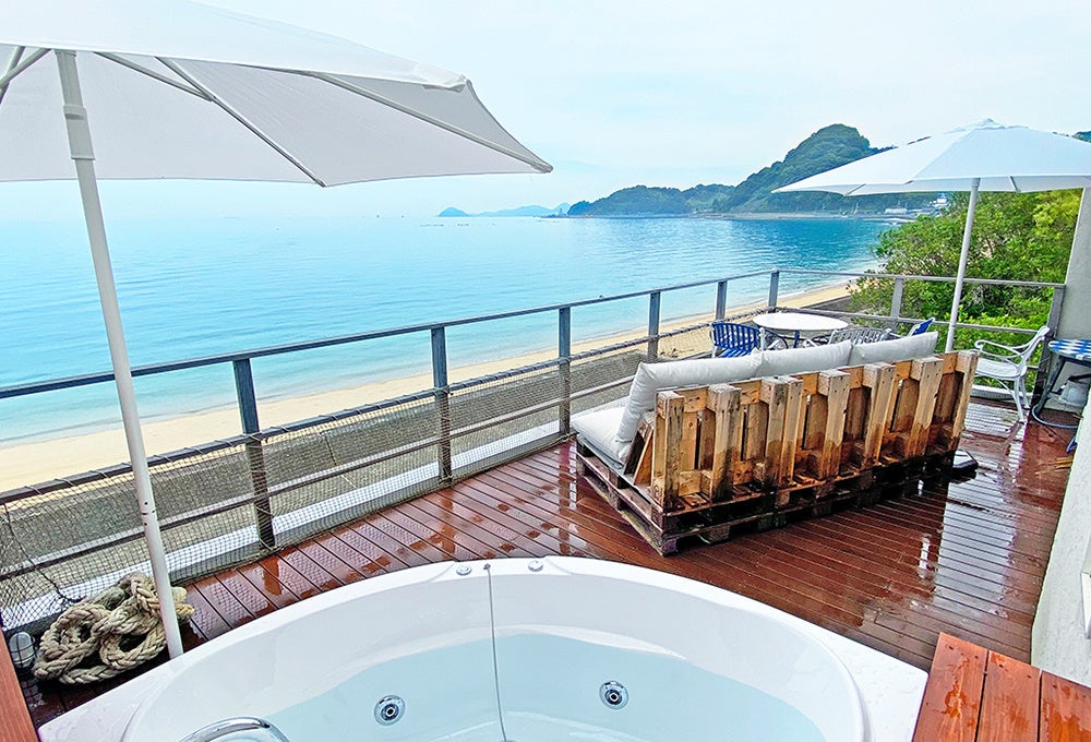 テラスにはジャグジーとゆったりとしたソファー。目の前には「世界の宝石」と称される瀬戸内海が広がります。