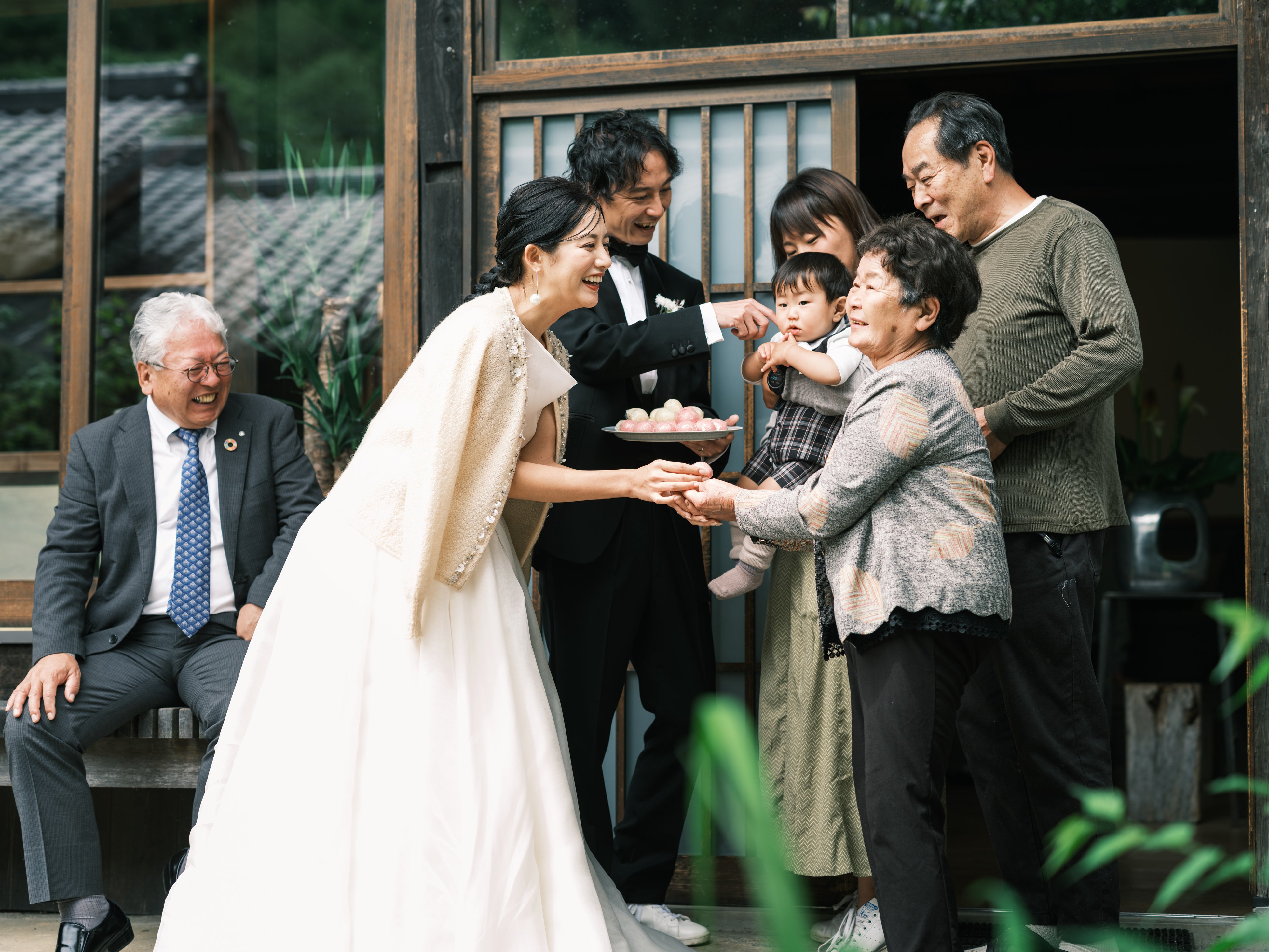 おふたりは前日から小菅村に滞在し、村人と婚礼の準備や家族だけの団欒の時間をゆっくりと堪能することで、「ご実家」のようにくつろいだ時間をお過ごしいただけます。そして挙式当日、村の人々にも祝福いただける古来からの開かれた「ご祝儀」で未来に向かってご縁を結びます。