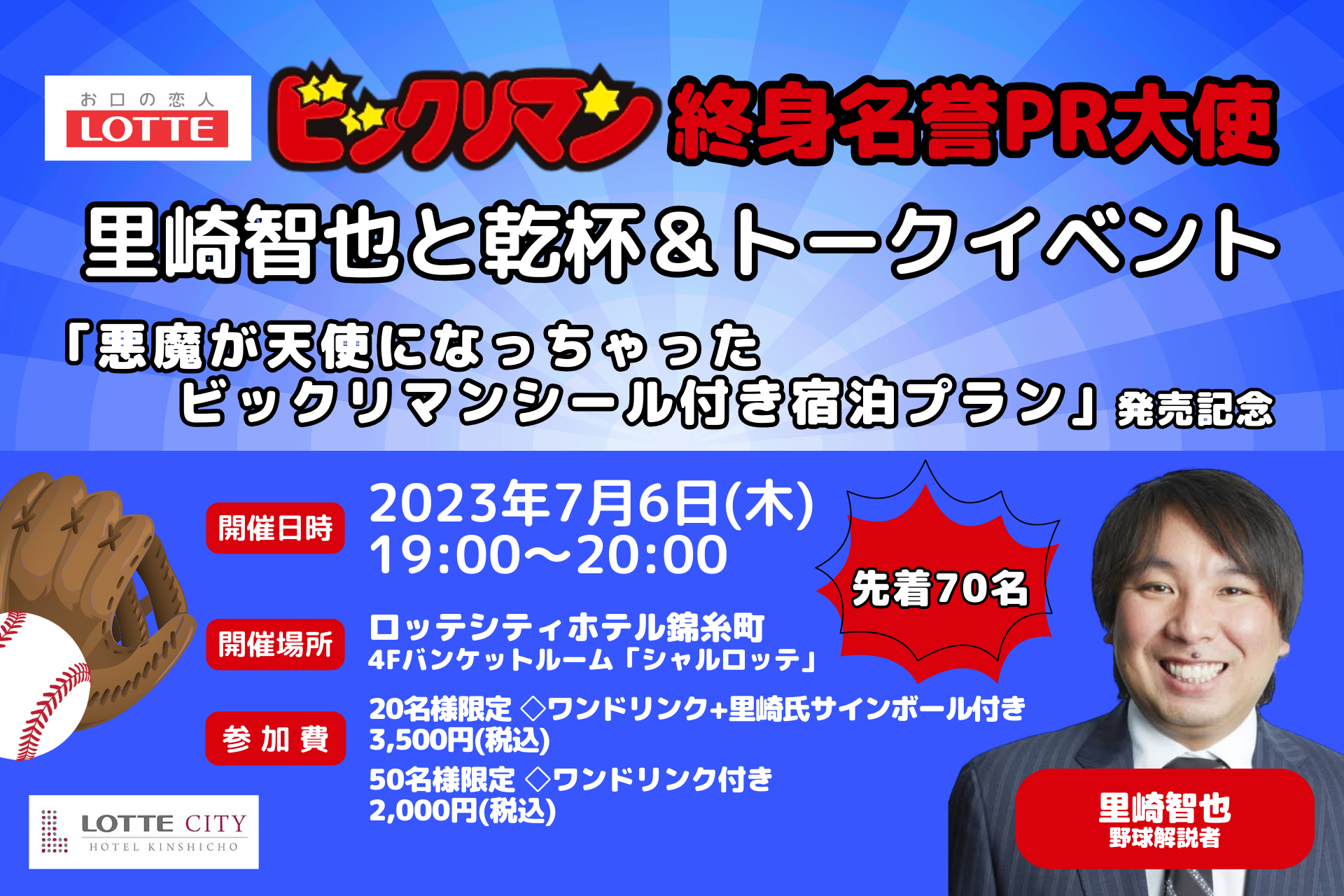 ロッテシティホテル限定 6カ月連続月替わりビックリマンシール企画「悪魔が天使になっちゃったビックリマンシール付き宿泊プラン」の発売を記念した本イベントでは、ビックリマン終身名誉PR大使を務める里崎氏をお迎えし、ビックリマンに対する熱い想いや、人気野球解説者里崎氏ならではの野球ネタなど、ここでしか聞く事の出来ないトークをお届けします。皆での乾杯からはじまり、ほろ酔い気分でトークをお愉しみ頂けます。20名様限定の里崎氏サインボール+ワンドリンク付きの限定チケットと、ワンドリンクチケット付きの通常チケット(50名様分)がございます。2杯目からの追加ドリンクも会場にて販売いたしますので(500円/1杯)、お酒と共に里崎氏のトークを愉しみながら、特別な時間をお過ごし下さい。