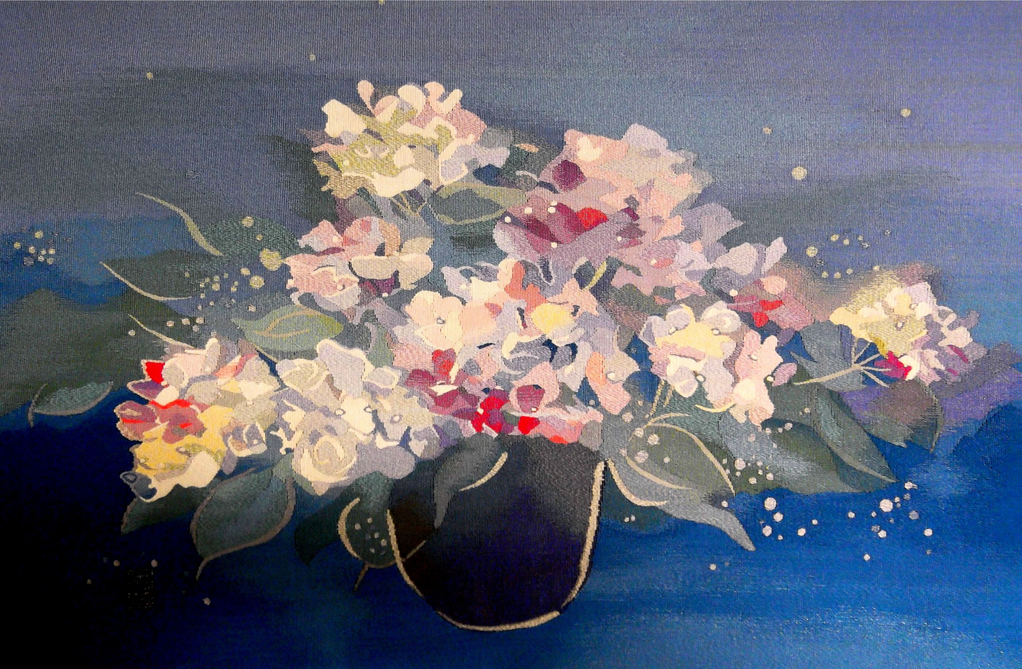 西陣織の中で最も歴史があり、爪で織る芸術品と呼ばれています。職人の爪と手足のみで織りあげるのが特徴です。多彩な単色糸を使用することに加え、それだけでは表現できない絶妙な色合いを「割杢(わりもく)」という綴織独自の技法で作られます。また、ボカシ(グラデーション)を表現する技術によって、作品に立体感・臨場感を出します。職人それぞれの技術と感性で織り上げられた織物は、絵画のようでありながら織物の深みを感じさせる作品となります。