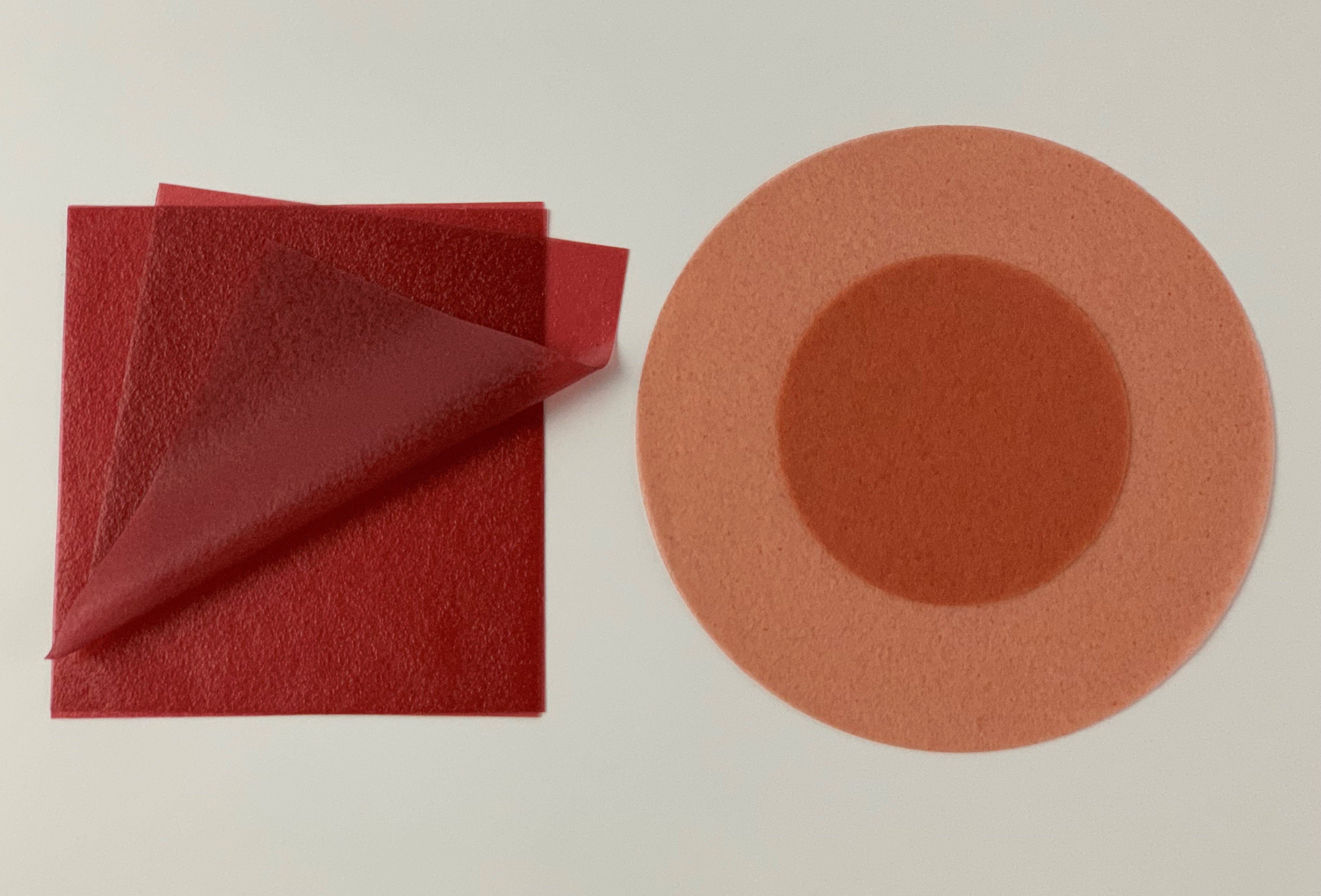 赤い色のシートはシソ梅干し、桃色のシートは南高梅を原料として作りました。