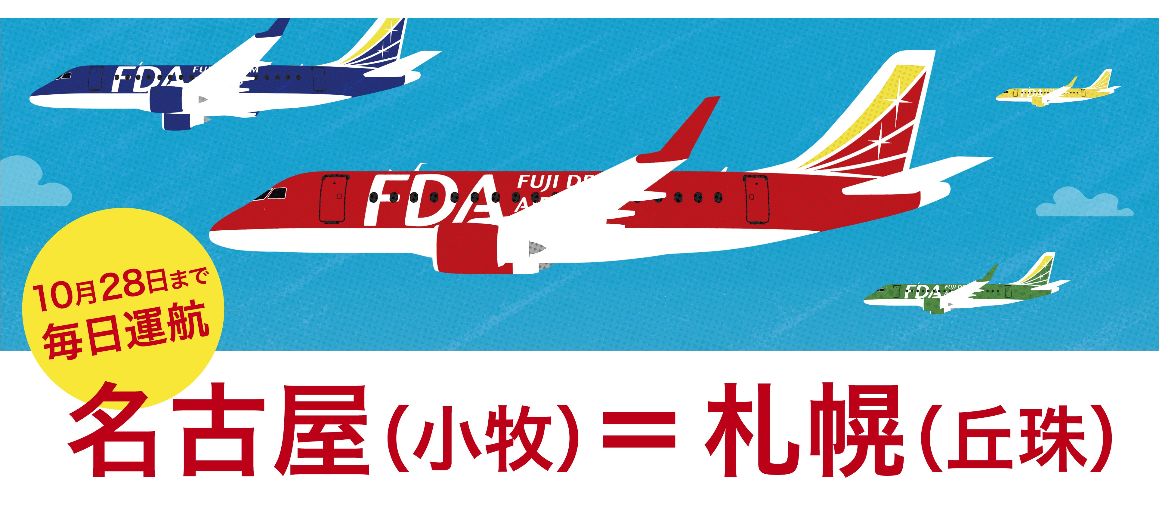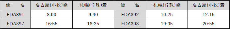 これにより、FDAの「名古屋(小牧)=札幌(丘珠)」線は、10月28日(土)までの夏ダイヤ期間を通じて毎日運航することとなります。秋のお出かけに、ぜひご利用ください。
