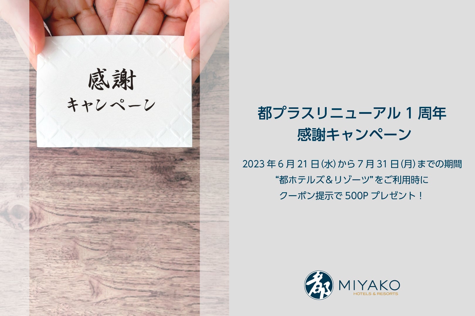 都ホテルズ&リゾーツの会員プログラム「都プラス」がリニューアルから1周年を迎えたことを記念し、日頃のご愛顧に感謝し「都プラスリニューアル1周年 感謝キャンペーン」を実施します。