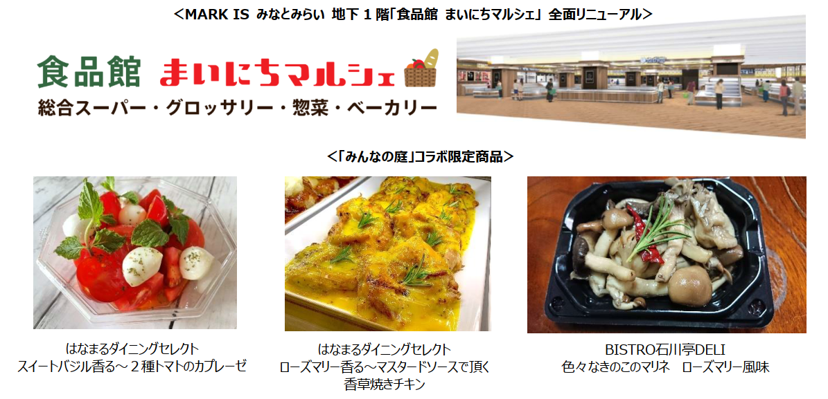 また、地下1階 「食品館 まいにちマルシェ」のリニューアルを記念し、施設5階「みんなの庭」とコラボした限定商品や、リニューアル記念特典をご用意しております。ローズマリーやバジルを使用した、カプレーゼや香草焼きチキンなど、ぜひこの機会に、MARK IS みなとみらいでしか味わえない商品をお楽しみください。