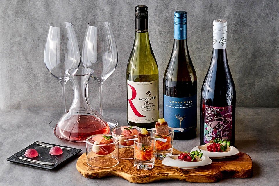 初夏をイメージし、ブレンドワインのさっぱりとした味わいに合うアミューズを3種類ご用意。また、ブレンドワインのロゼカラーからインスパイアされ、見た目にも鮮やかな琥珀寒はボージョレ・ヌーヴォーを使用。華やかな香りと周りのザクザクとした食感、中の柔らかなゼリーが、アミューズとは異なるテイストを引き出します。
