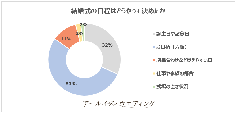 大安や友引等のお日柄で決めた方が最も多く、次いで誕生日や記念日に合わせて決めた方が多い結果となりました。そのほか、語呂合わせで決めた方やご自身や家族の都合に合わせて決めた方、また結婚式場の空き状況に合わせた方がいらっしゃいました。