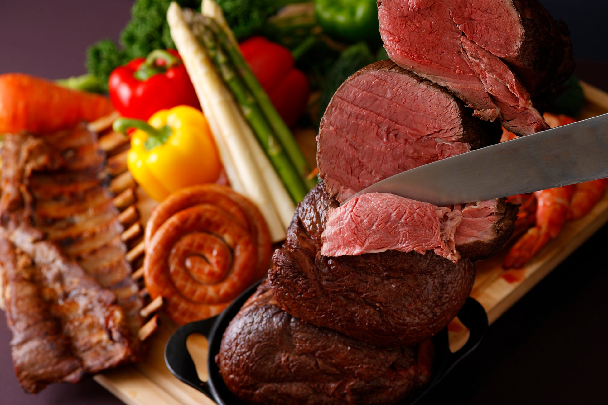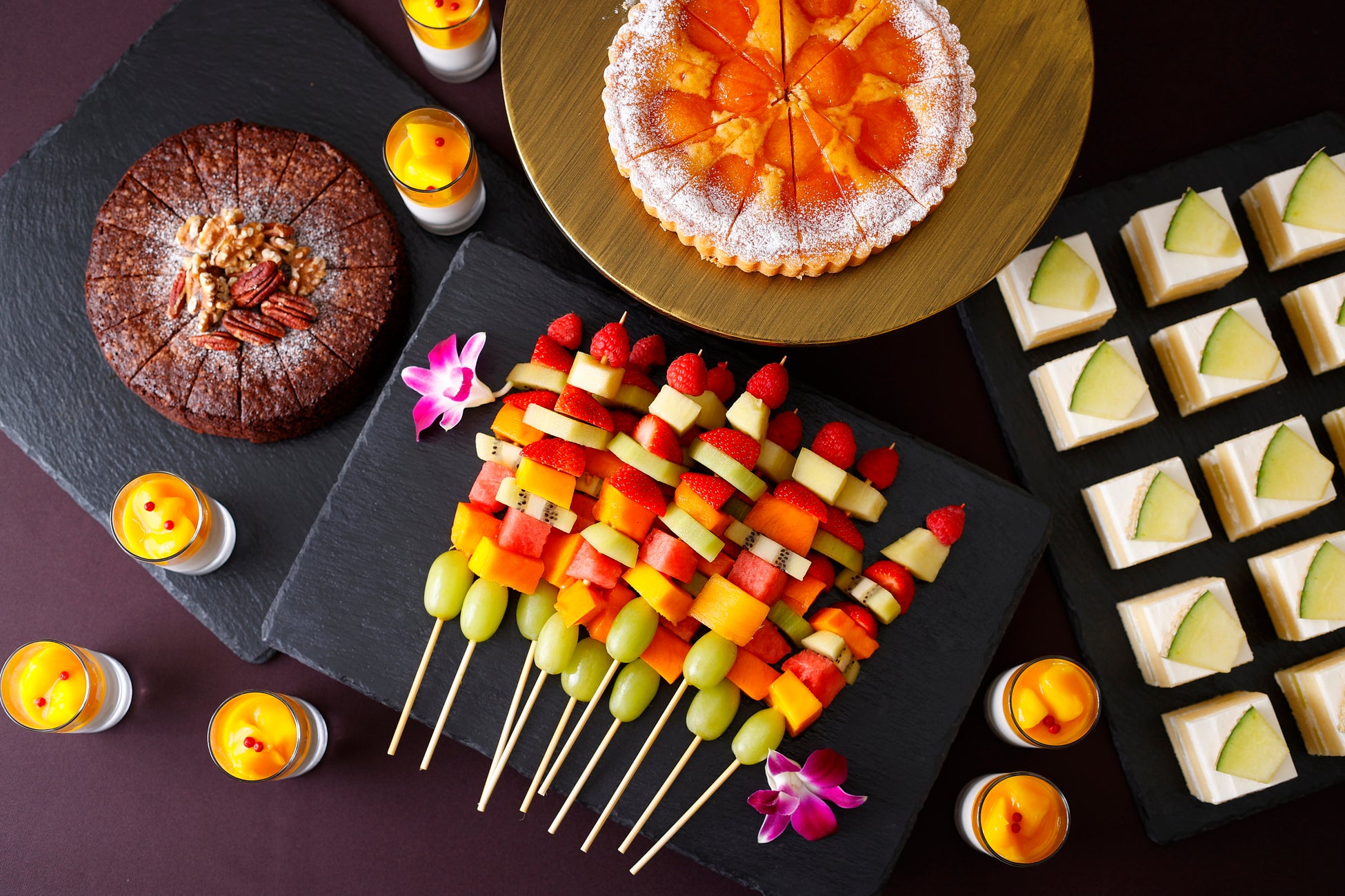 お食事は、豪快なグリル料理を中心にラインナップ。中でも、旨みが凝縮した「牛もも肉のシュラスコ」は、塊肉をじっくり3時間かけ低温調理してから焼き上げることで余分な脂が落ち、柔らかくジューシーな仕上がりです。他にも、ハニーチキンや手ごねハンバーグ、鮮度の高い魚介などを目の前で焼き上げる鉄板料理、点心や麻婆豆腐などの中国料理、握り寿司などの日本料理と、ホテルブッフェならではのバラエティに富んだメニューをご用意いたします。