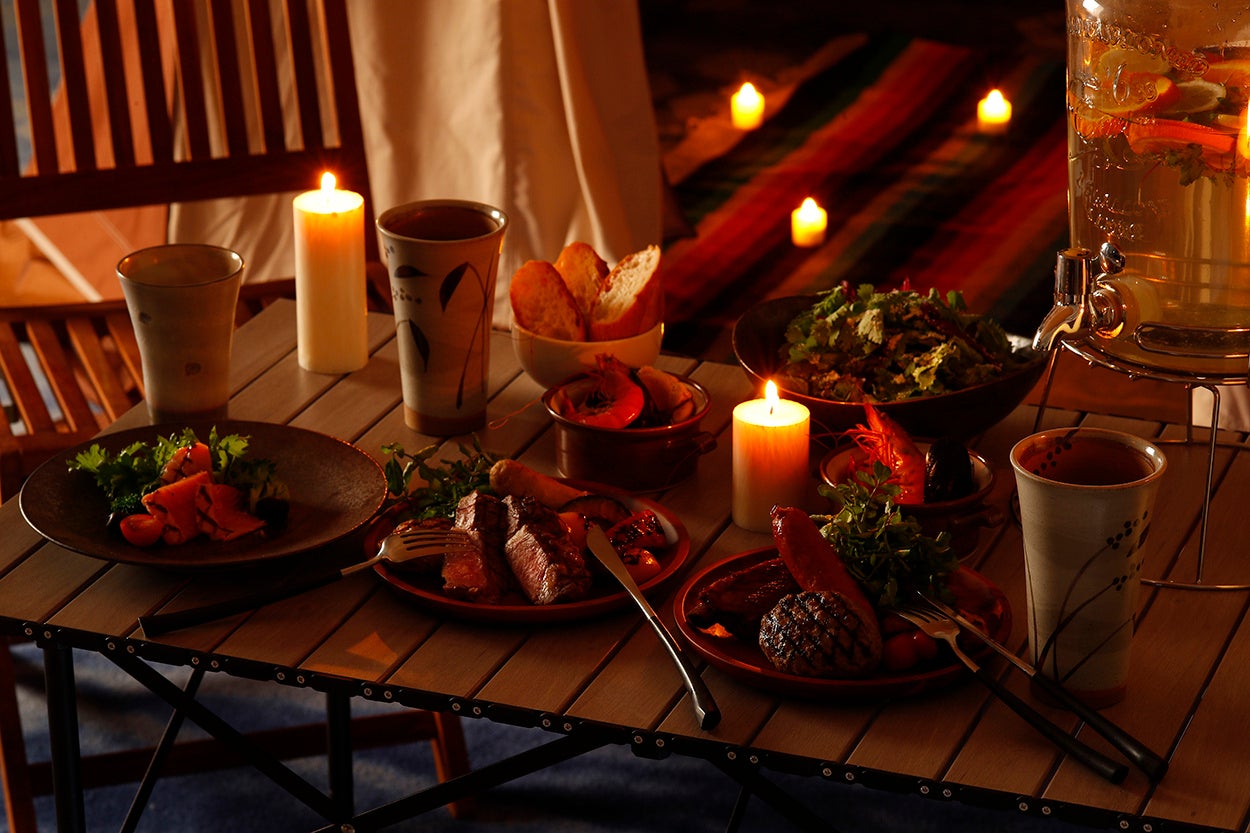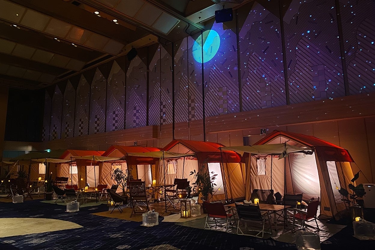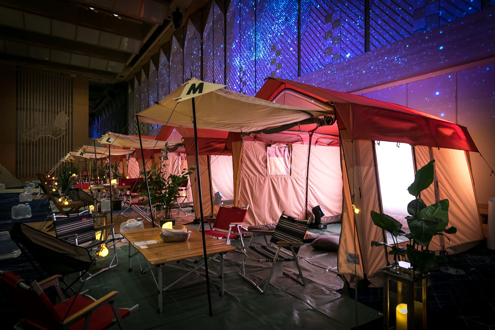 グランピング会場となるのは、ホテルのメインバンケット「舞扇(まいおうぎ)」。天井高が7.8mもある開放的な空間に、実際にアウトドアで使用する本格的なテントを張り、テーブルやチェア、ランタンなどを配します。テント1張の区画を貸し切りでご用意し、お食事は、ブッフェスタイルでお愉しみいただきます。プロジェクションマッピングによる星空の演出や、森の中にいるかのようなヒーリング音楽など、都心にいることを忘れさせてくれるようなムードたっぷりの会場の中で、ホテルシェフが作る贅沢なメニューを存分に味わえるのは、新感覚の体験です。